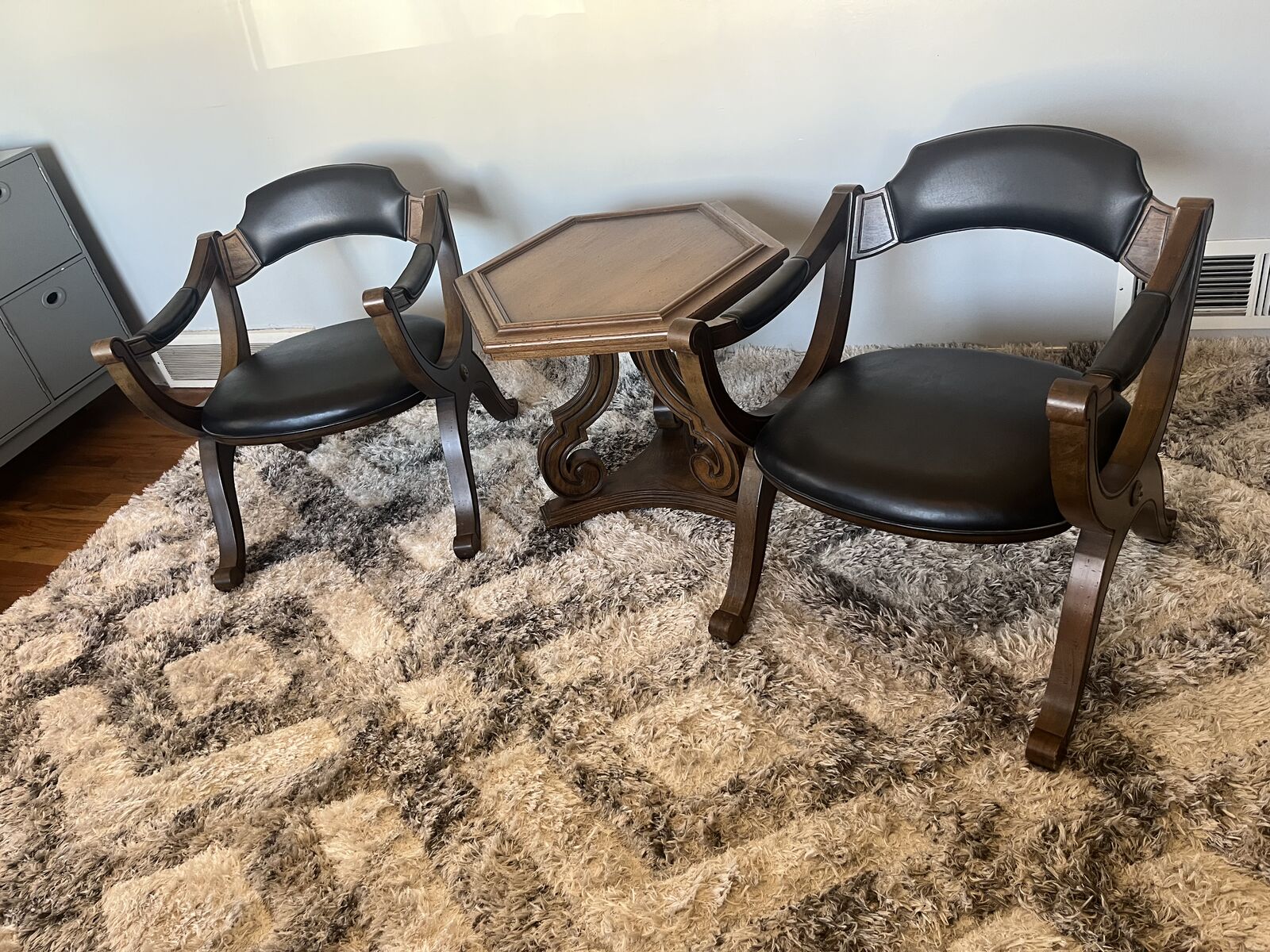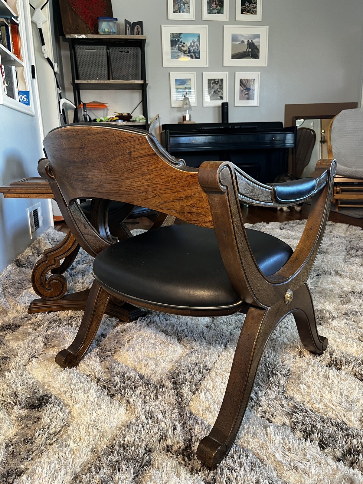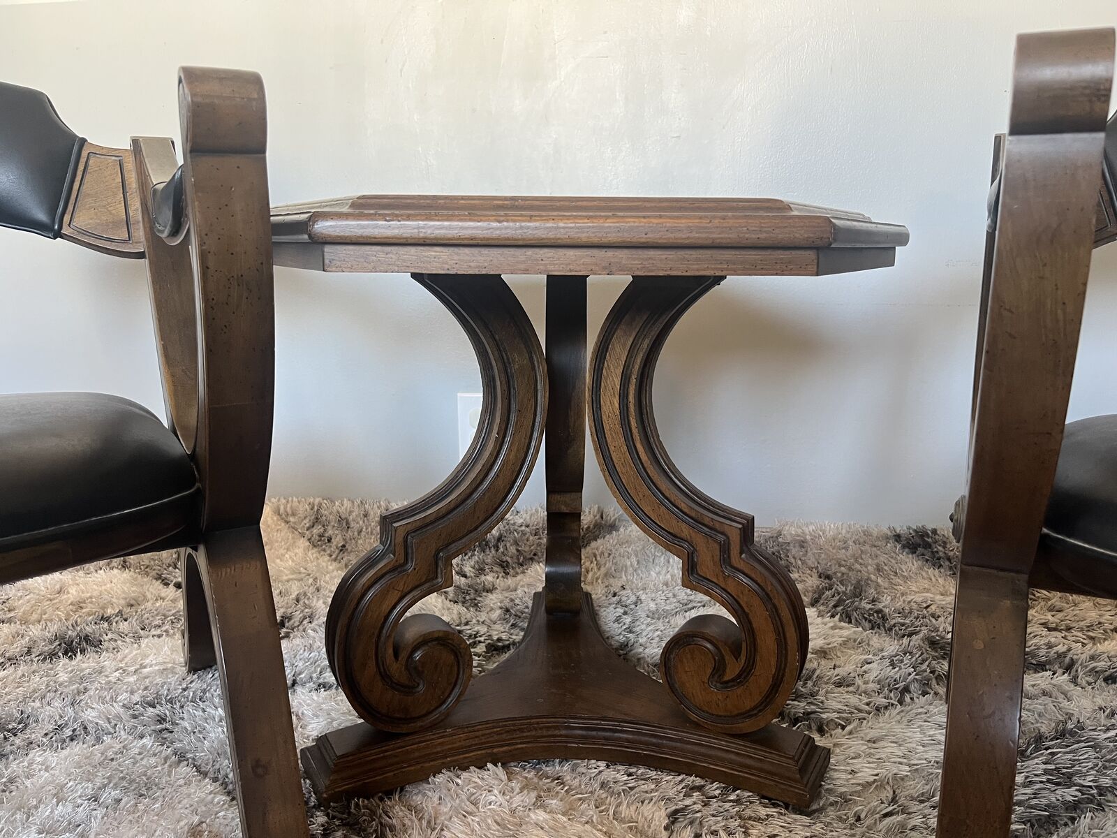 PayPalBeautiful matching pair of vintage Drexel Furniture Company chairs. These are solid, well-crafted pieces with classic Regency / Neoclassical styling — curved frames, brass rosette detail, and original black upholstered seats and arms. Both chairs match in condition and finish, which is increasingly hard to find. Sturdy, comfortable, and perfect as desk chairs, accent seating, or statement pieces in a living room or office. Authentic Drexel Furniture Company labels intact Solid hardwood frames Original upholstery with light, age-appropriate wear No structural issues & Striking vintage Brandt Furniture table with dramatic scroll-style legs and a thick, molded top. Heavy, solid, and well built — this is not veneer furniture. Works beautifully as; A console table Accent table Entry or hallway piece