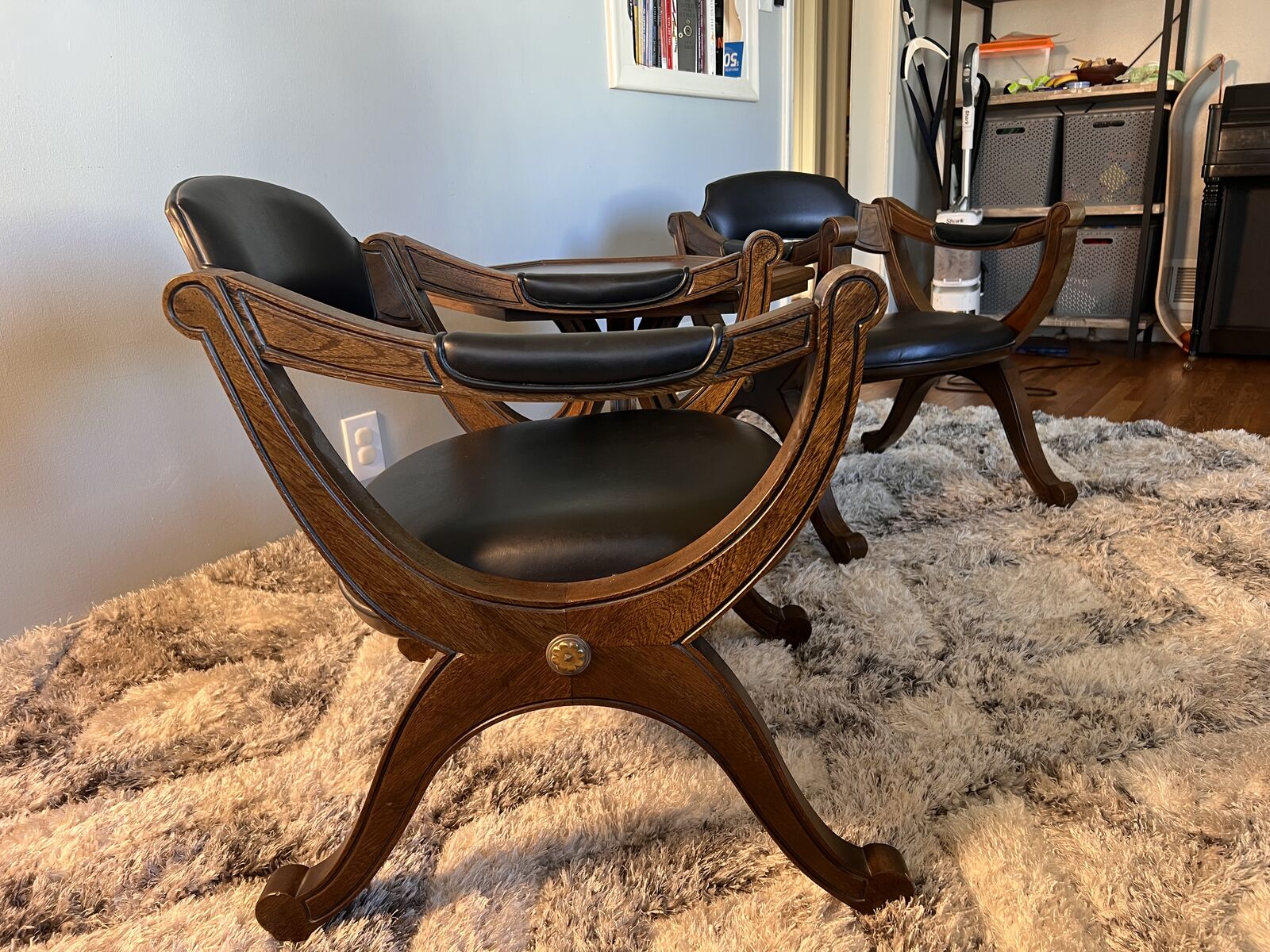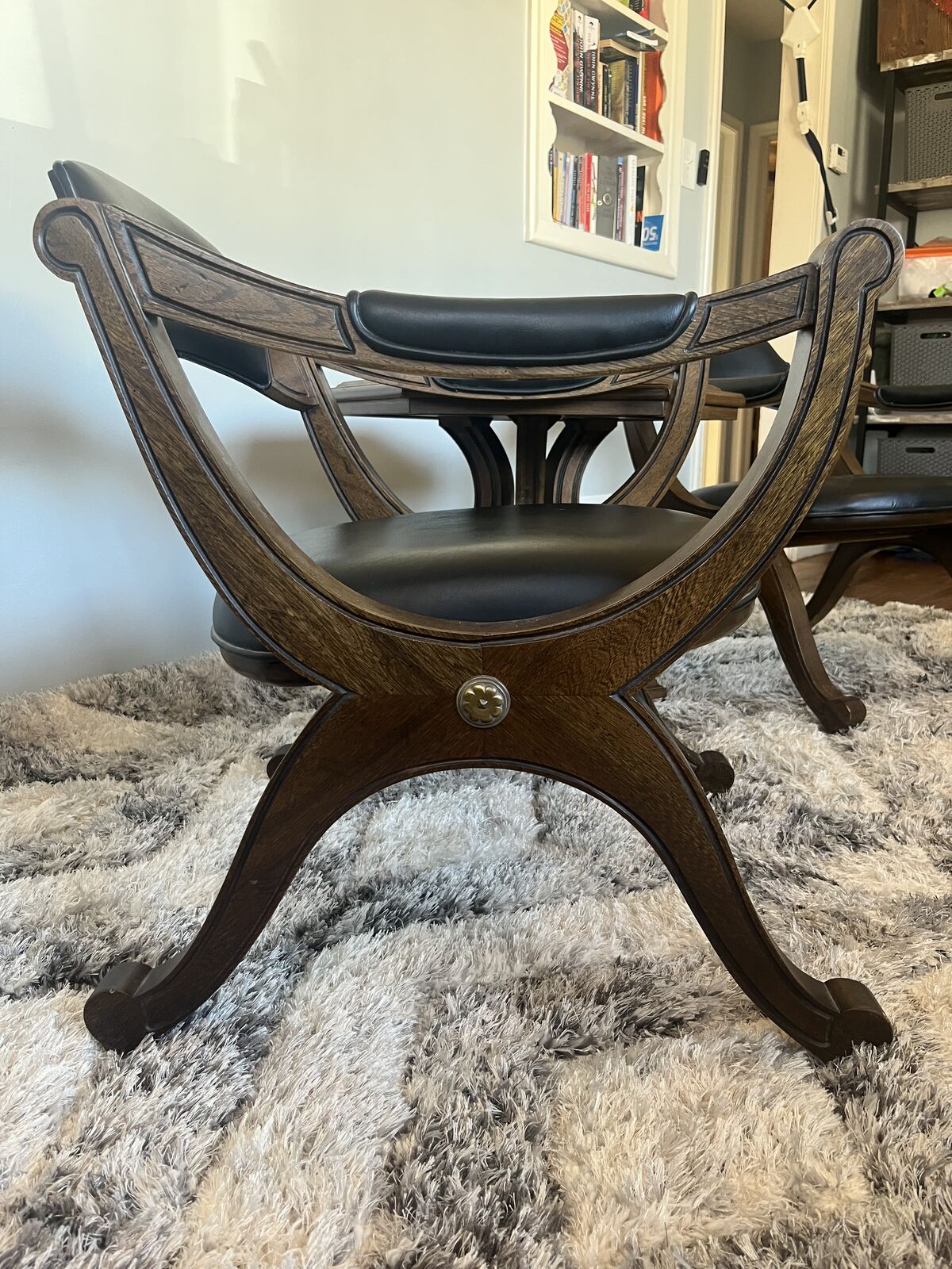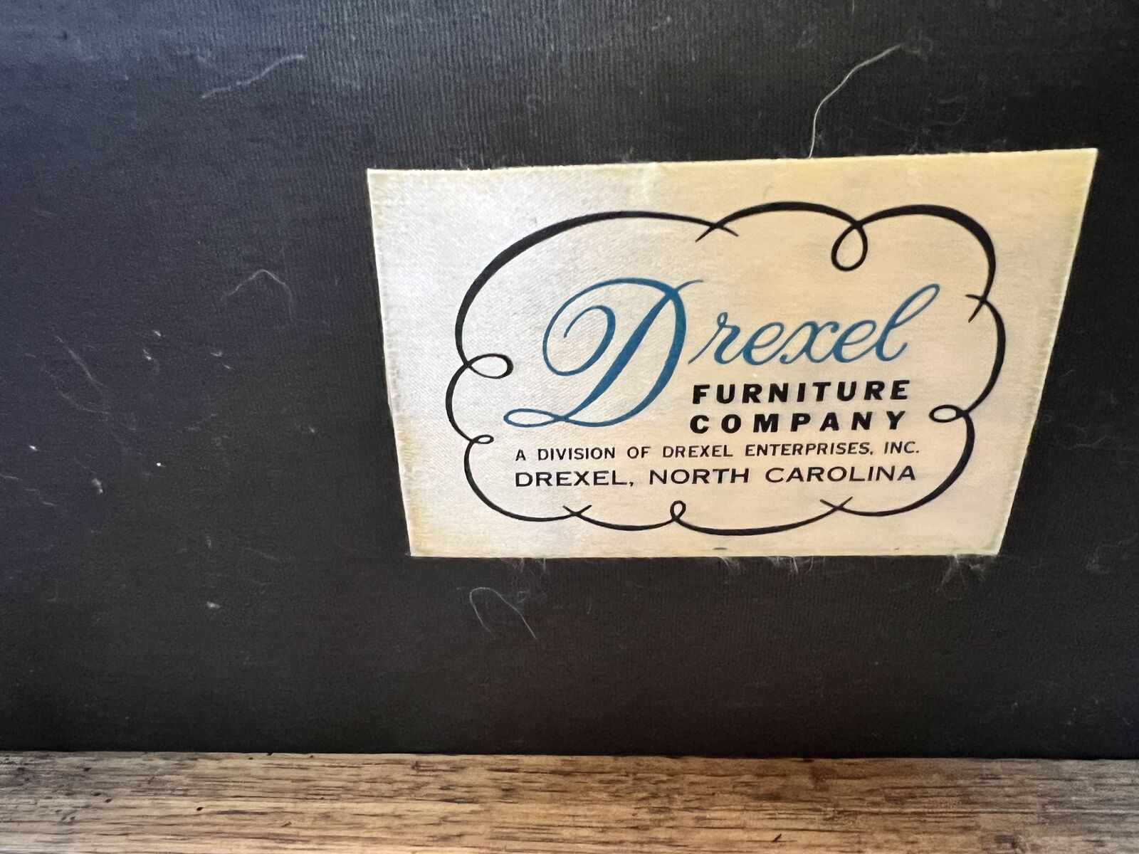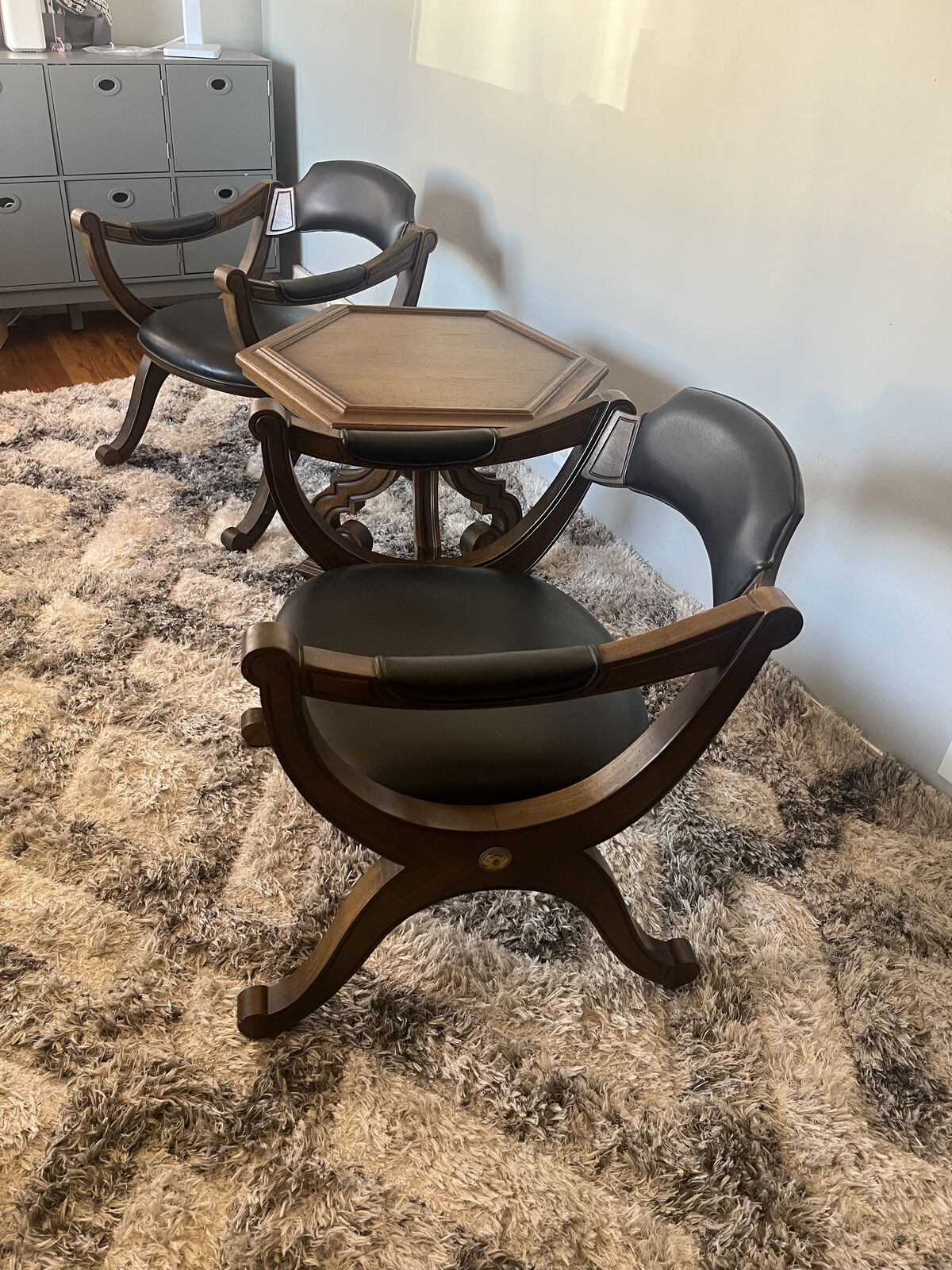 PayPalBeautiful matching pair of vintage Drexel Furniture Company chairs. These are solid, well-crafted pieces with classic Regency / Neoclassical styling — curved frames, brass rosette detail, and original black upholstered seats and arms. Both chairs match in condition and finish, which is increasingly hard to find. Sturdy, comfortable, and perfect as desk chairs, accent seating, or statement pieces in a living room or office. Authentic Drexel Furniture Company labels intact Solid hardwood frames Original upholstery with light, age-appropriate wear No structural issues & Striking vintage Brandt Furniture table with dramatic scroll-style legs and a thick, molded top. Heavy, solid, and well built — this is not veneer furniture. Works beautifully as; A console table Accent table Entry or hallway piece