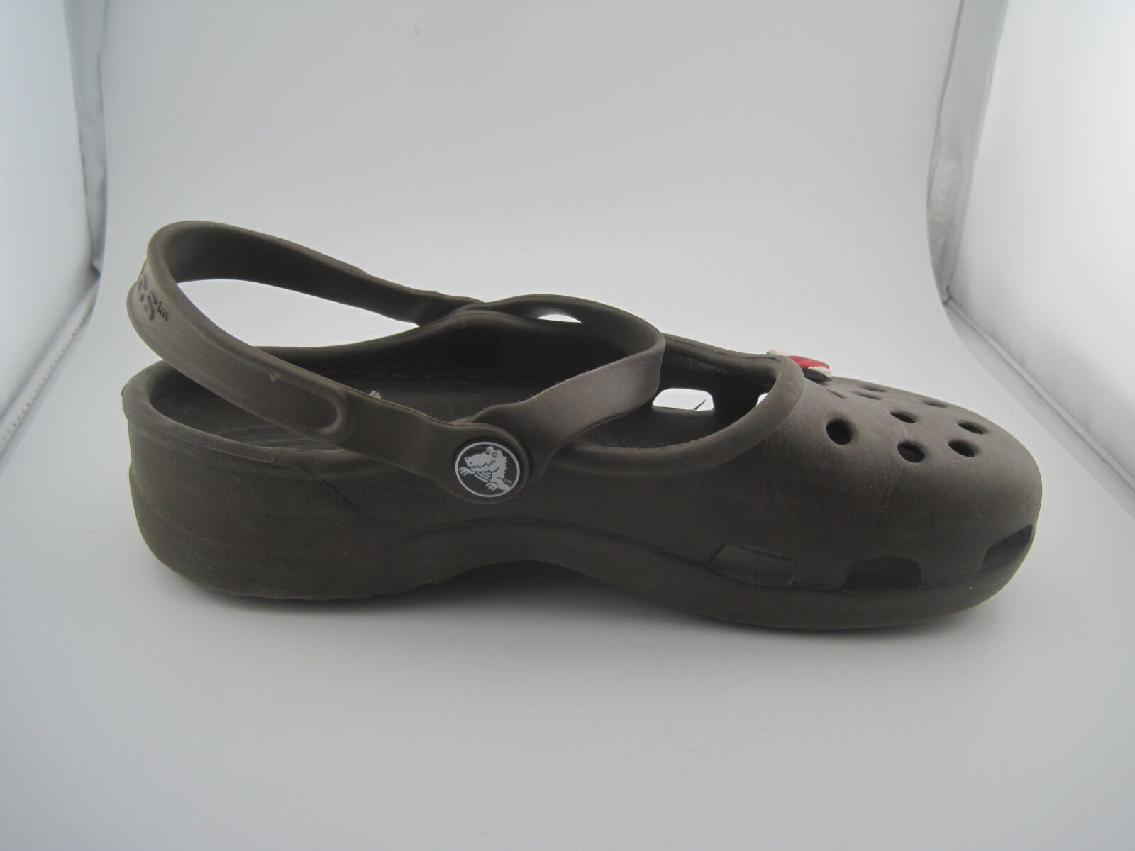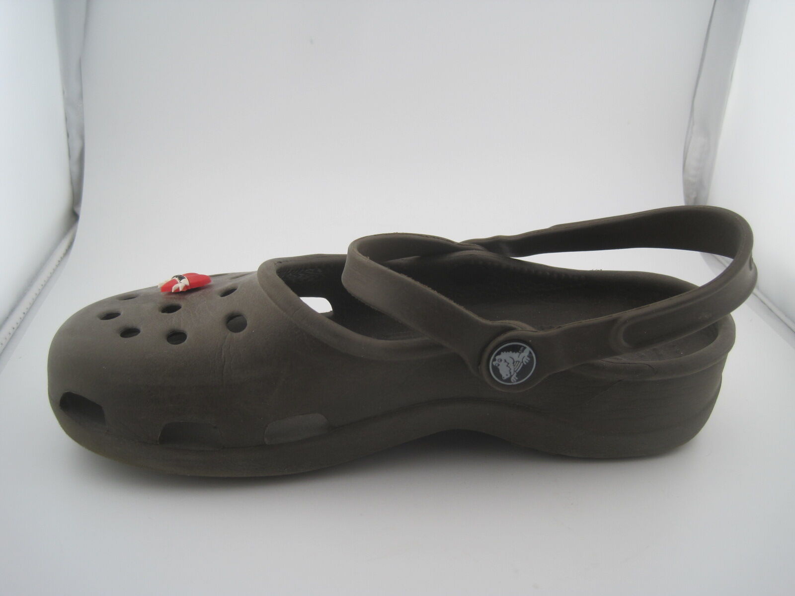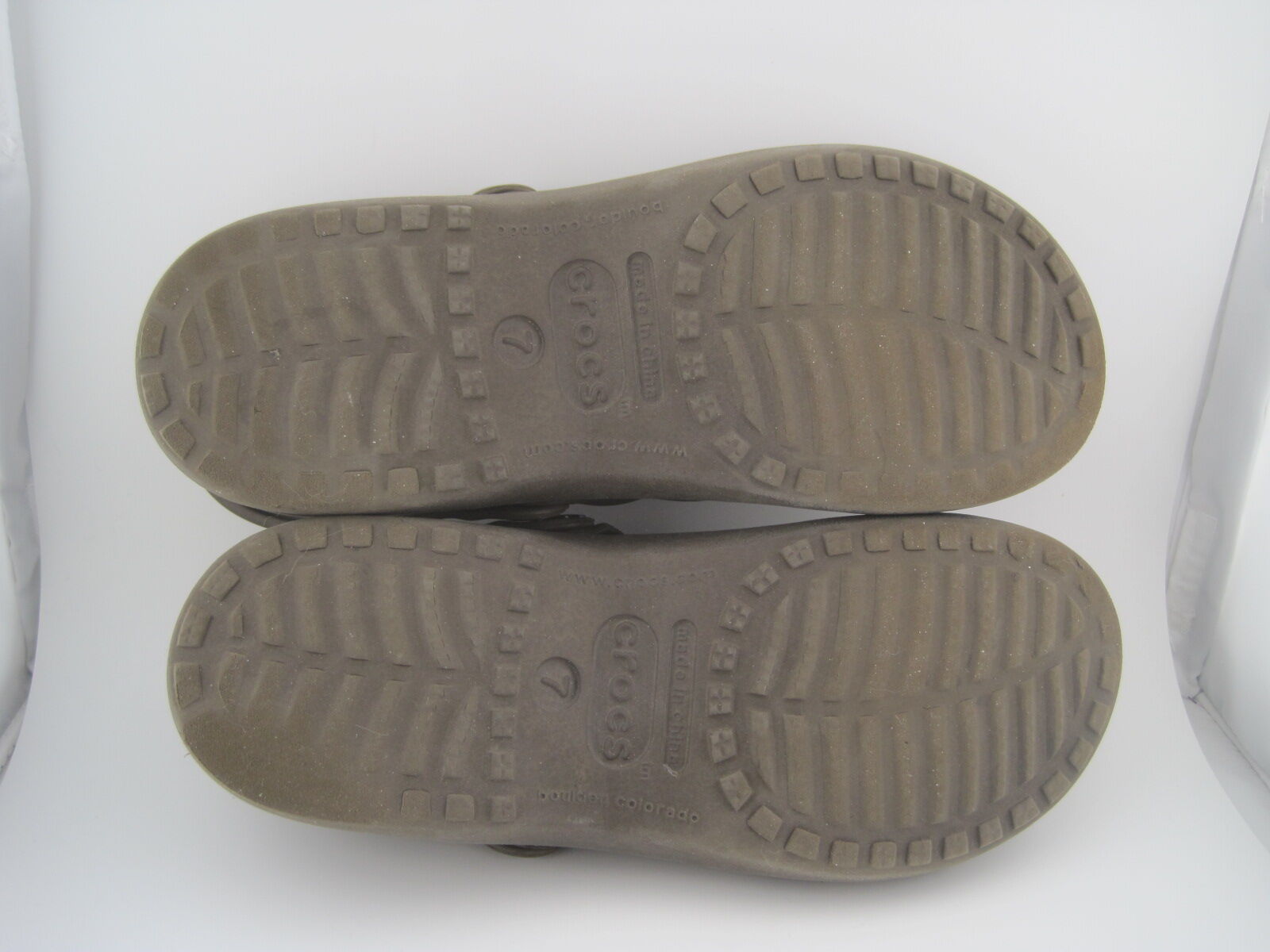The product is a pair of Crocs Classic Clogs in brown color, designed for women in size 7. These slip-on clogs feature a low top shoe shaft style with a round toe shape, making them perfect for casual and travel occasions during the summer season. The shoes are lightweight, comfortable, and breathable, with an ankle strap for added support. Made of rubber, these Crocs are the classic style with a solid pattern and logo accents, ideal for walking and school activities. The brand Crocs is known for its comfortable and durable footwear, making these clogs a great choice for everyday wear.