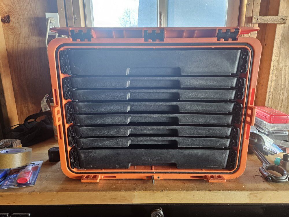 ZellePelican Style tool box by Snap On I used for aviation maintenance for 5 years. Surface scuffed from traveling. I cleaned out the rails and lubed the sliders. Seal and latches are in good condition