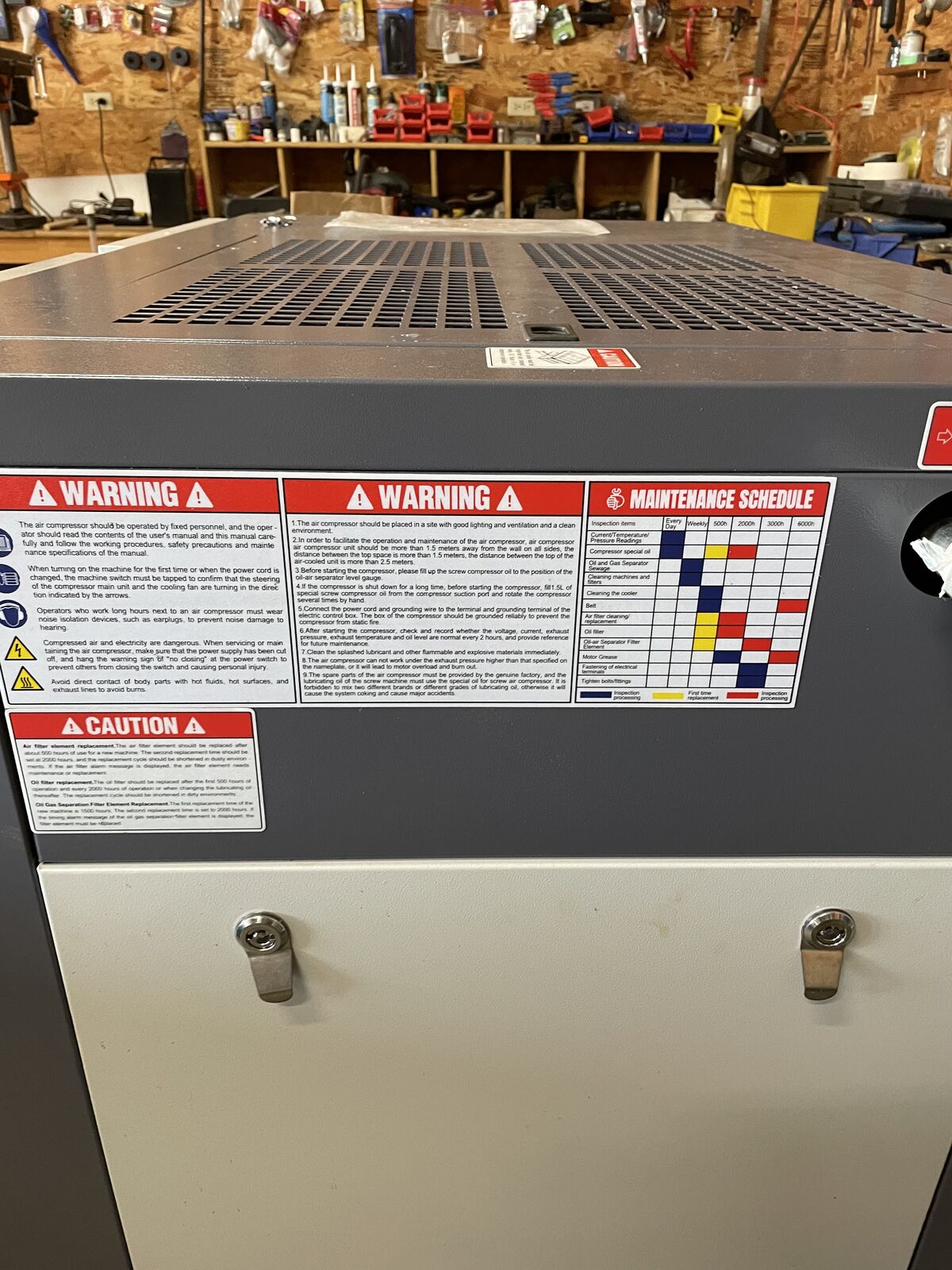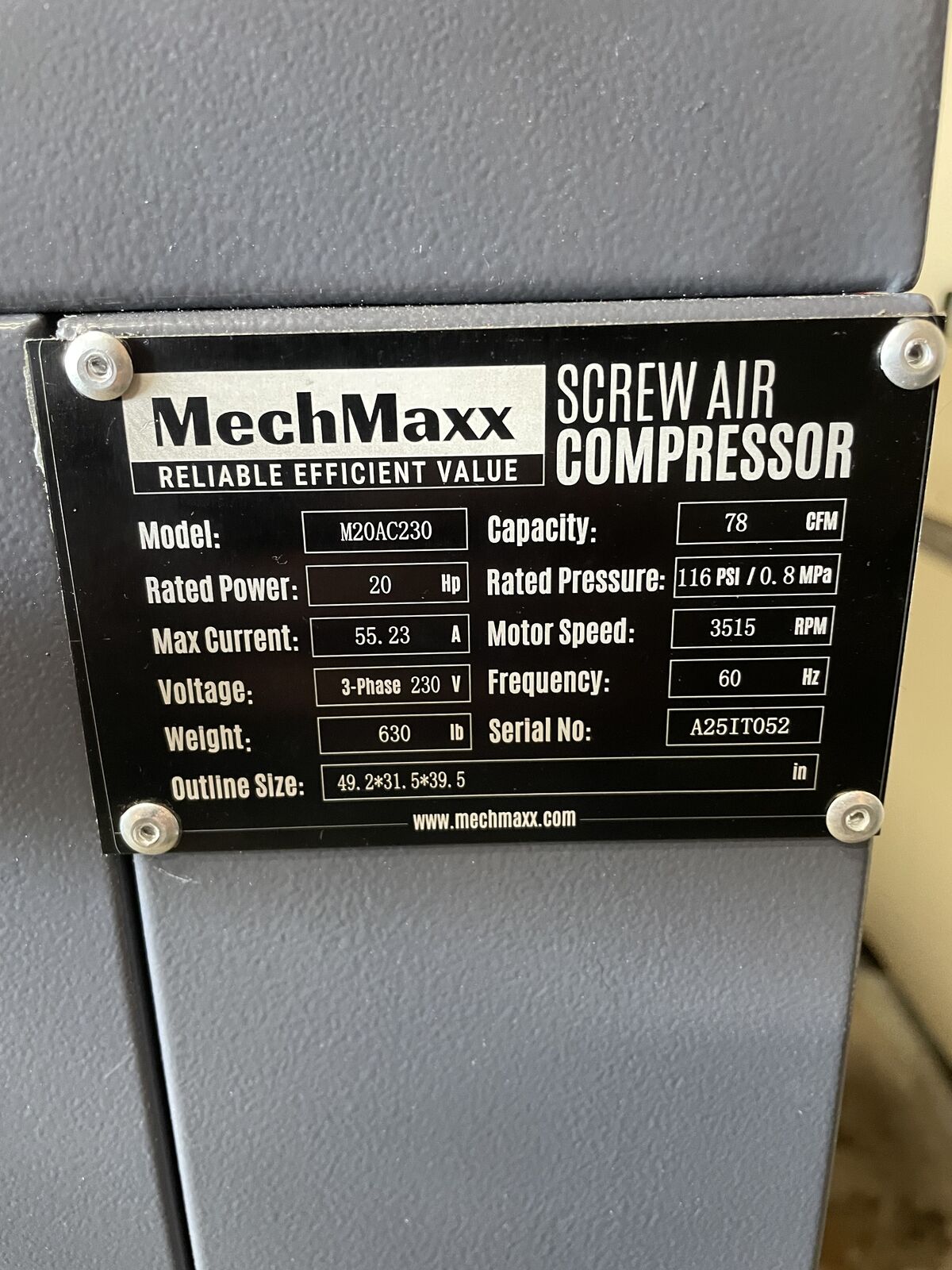 Mechmaxx Ac230 rotary screw air compressor industrial brand new. Is to big for the size for my CNC machines asking 4000$ obo cash only buyer picks up. It also has all touch screen for delay start and all settings.