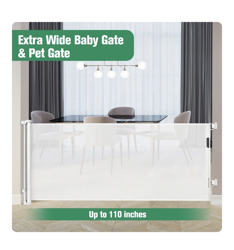 VenmoMom's Choice Awards Winner - 110 Inch Extra Wide Baby Gate for Large Openings Retractable Baby Gates Indoor Outdoor Extra Long Dog Gate for Doorway Stair Gates for Kids or Pets Extra Large Dog Gate White (33 Tall × 110 Wide) Brand New