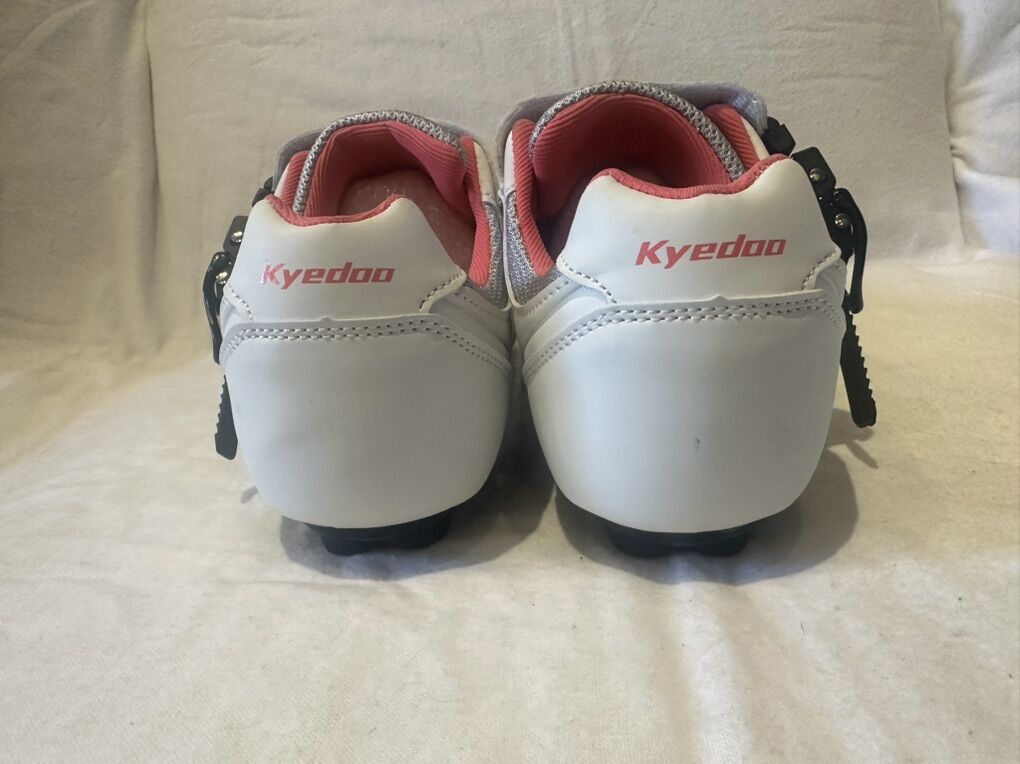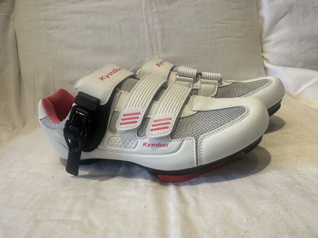 Kyedoo EU 40 or Wmns 8.5 NEW Delta cycling shoes. These are white and gray mesh with pink accents. See photos for details. I take cash or Venmo, but cash is preferred. Text is best. 801-201-4446. Check out my other ads for additional sizes and styles.