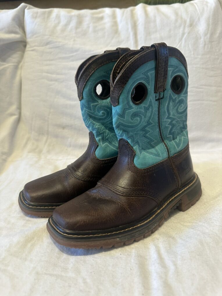 Rocky youth size 2, kids 8“ saddle, brown/teal leather square toed western boots. These are in good condition, see photos for details. I take cash or Venmo, but cash is preferred. Text is best. 801-201-4446 check out my other ads for additional sizes and styles.