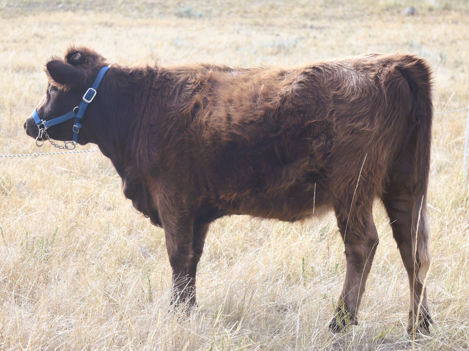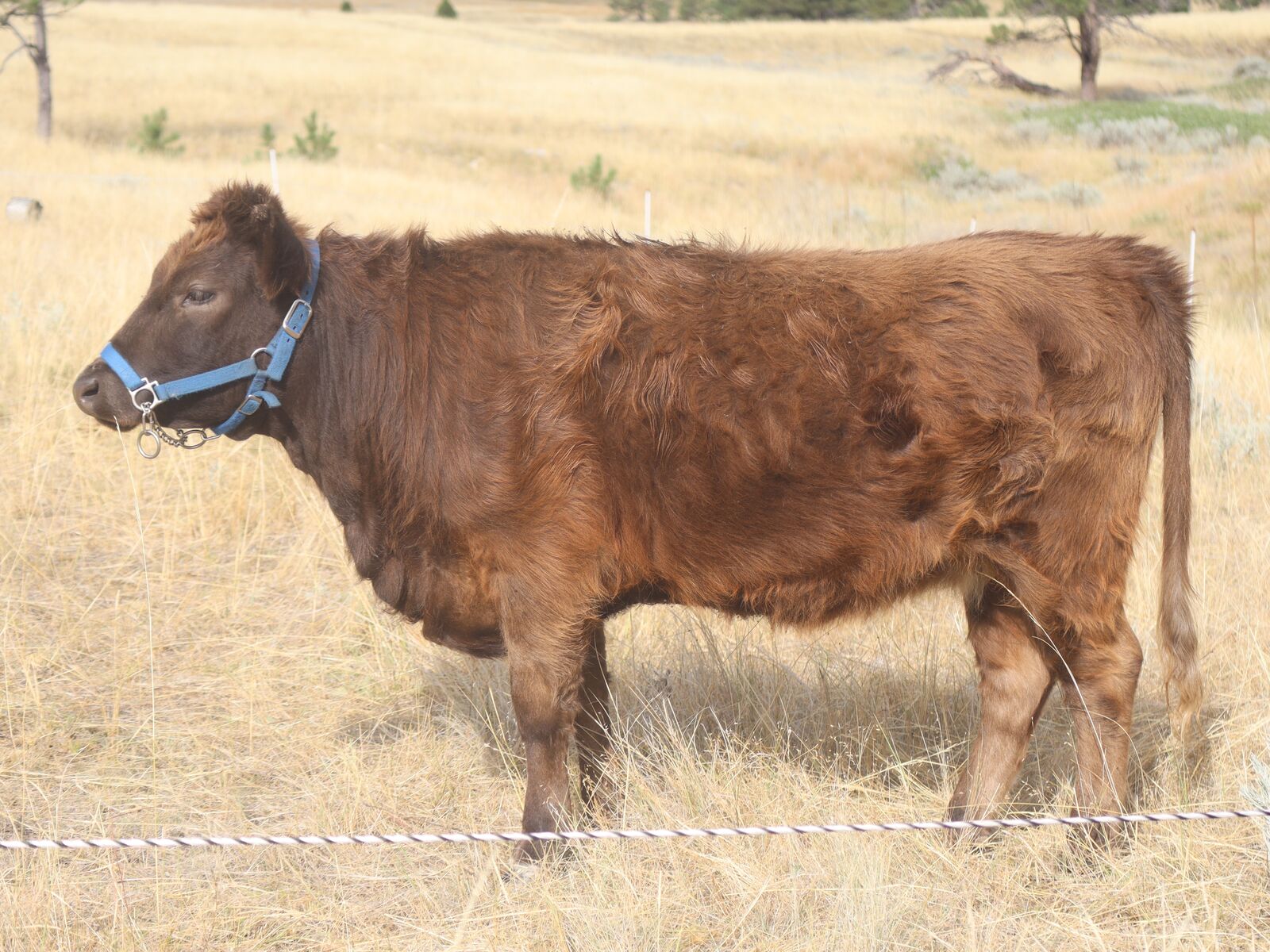 Whitney is confirmed bred to a Lowline Angus bull, and vet estimates a May calf. Halter broke, but may be rusty as she's coming back from spending a couple months with the bull in pasture. She had a fantastic set of highland horns coming in, but was de-horned because the rest of our herd was polled, and she knew it. Pics of dam and sire available. $3,500 if we can get her first heifer calf out of a bull of our choice.