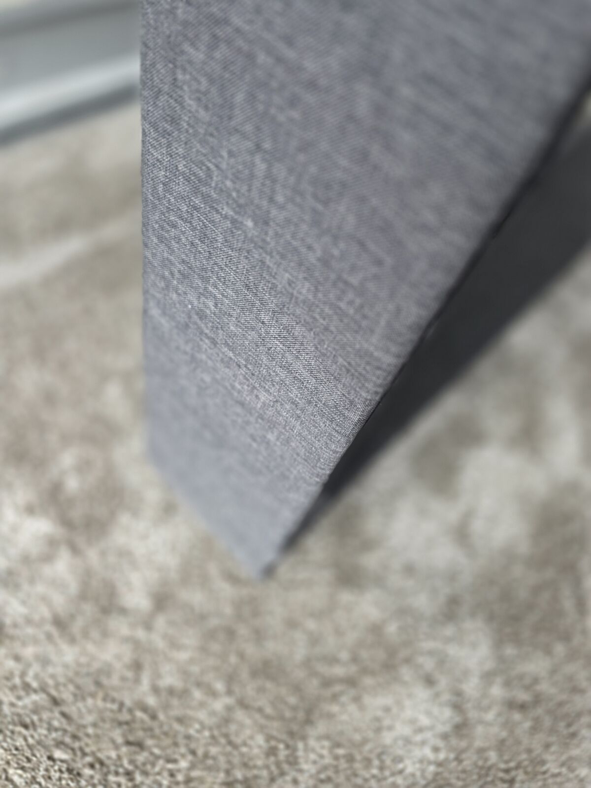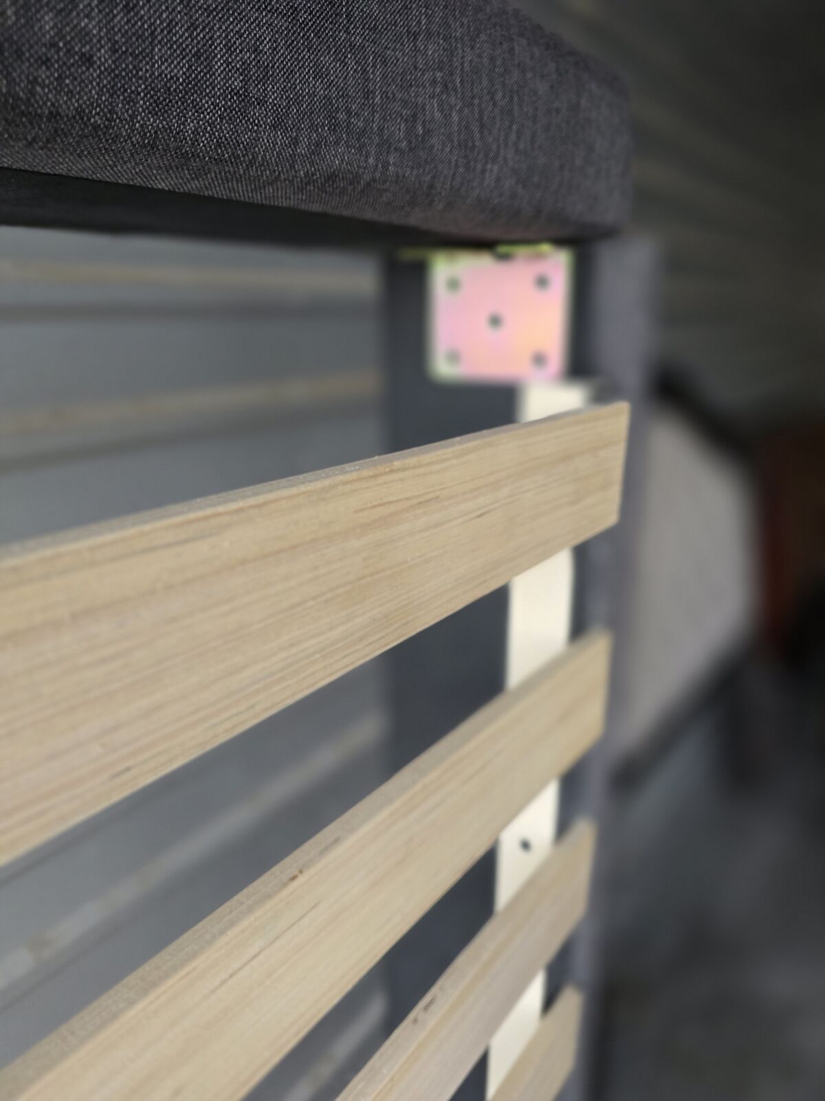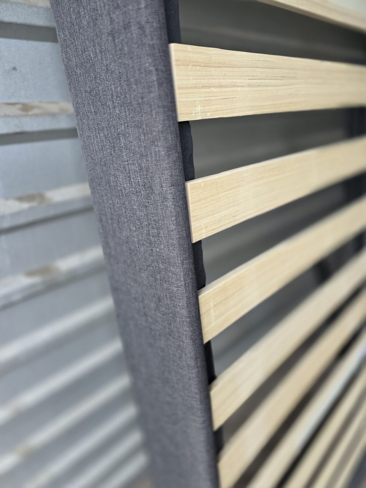 Sturdy, well-built slatted bed base with a clean, modern upholstered frame. Finished in a dark charcoal/gray fabric with natural light wood slats and a black metal center support, this piece is both durable and visually neutral.