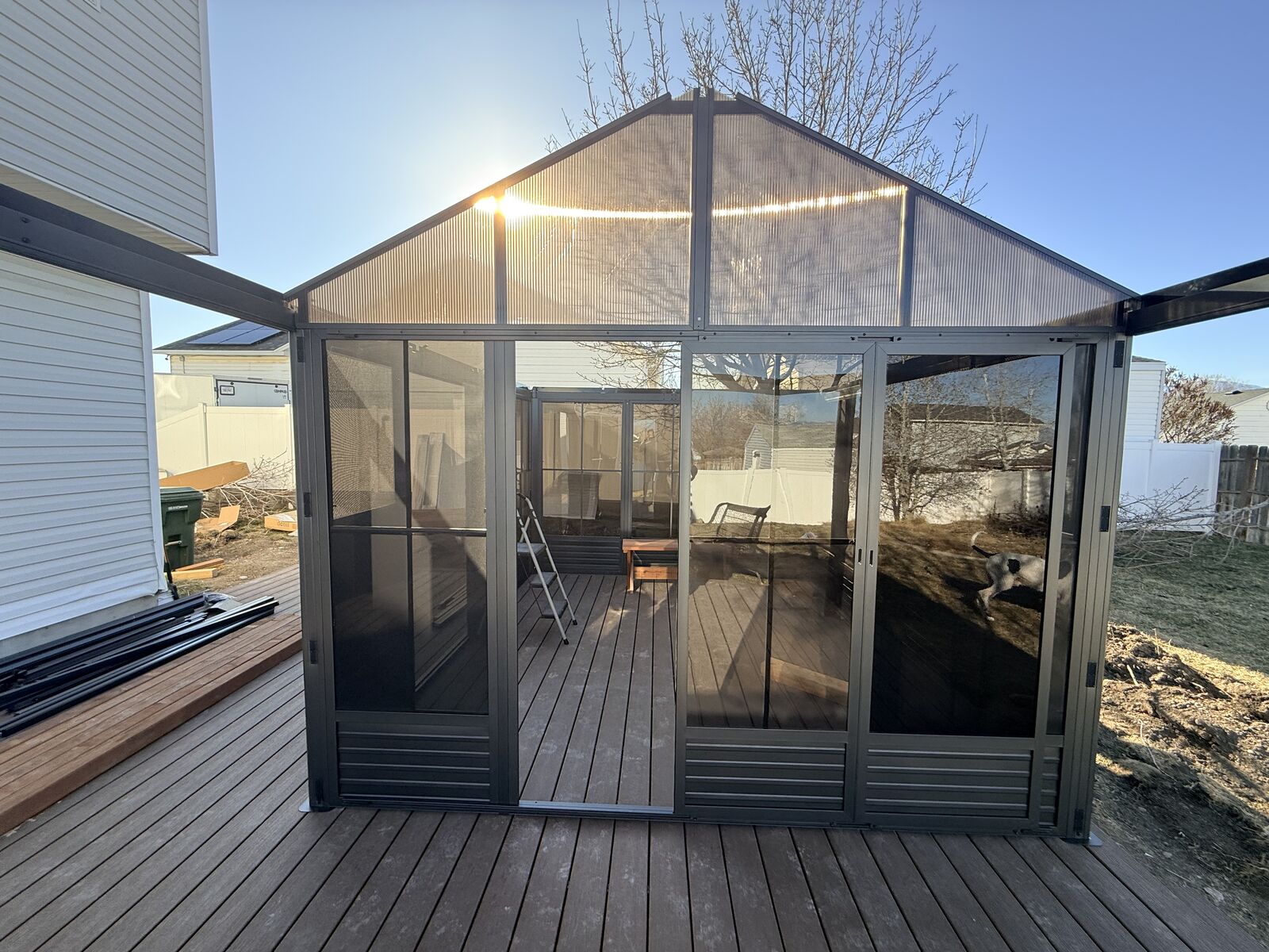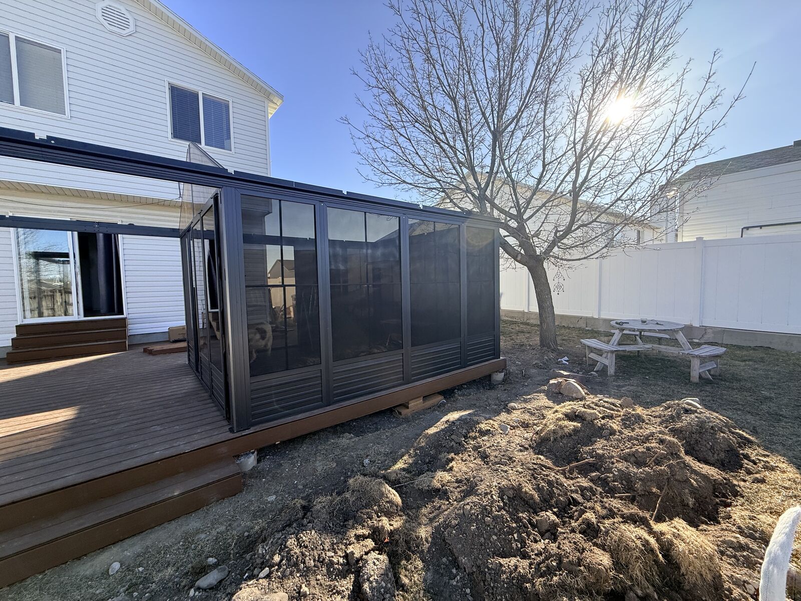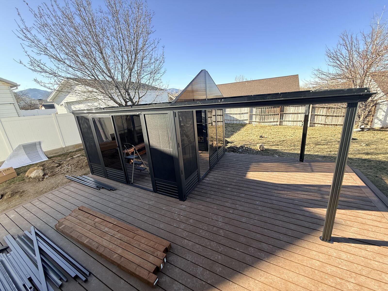 High-quality DOMI louvered aluminum gazebo designed to mount to a house or structure. Very solid and modern.