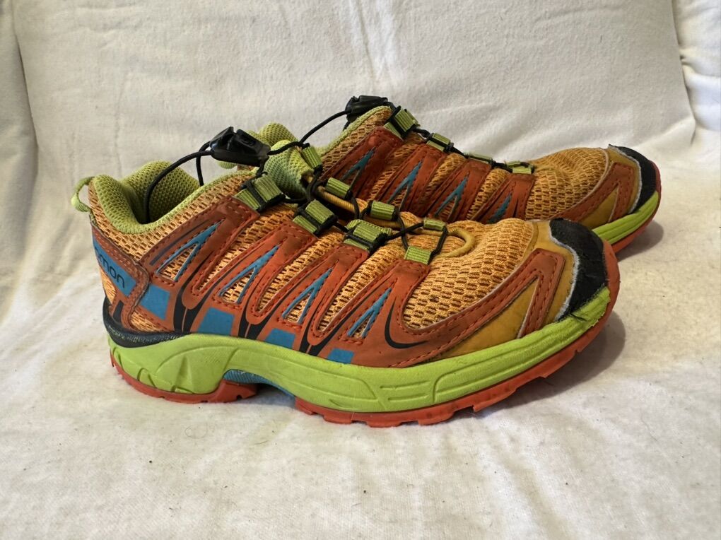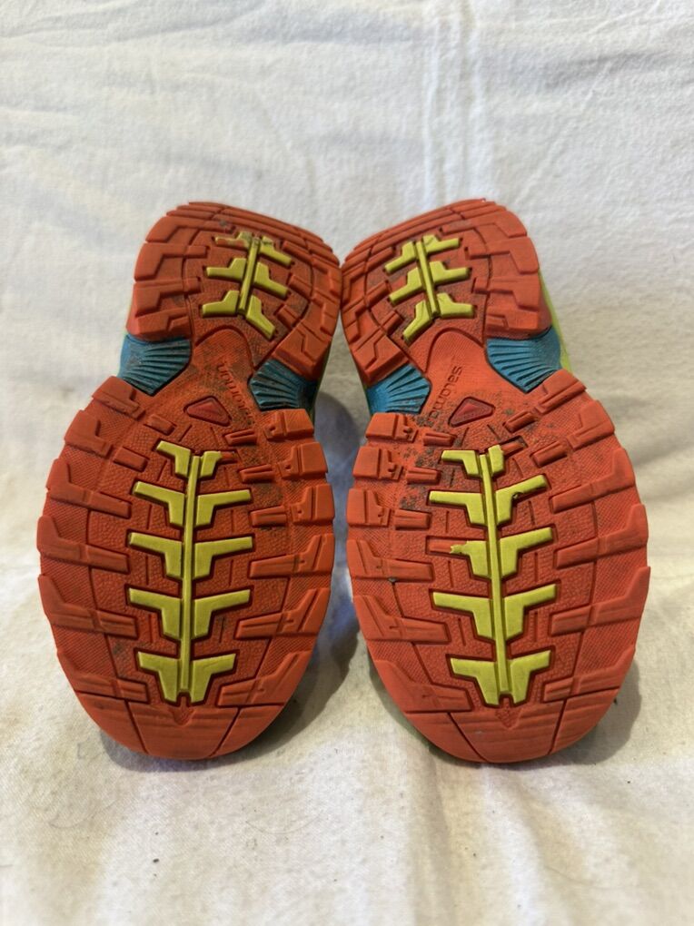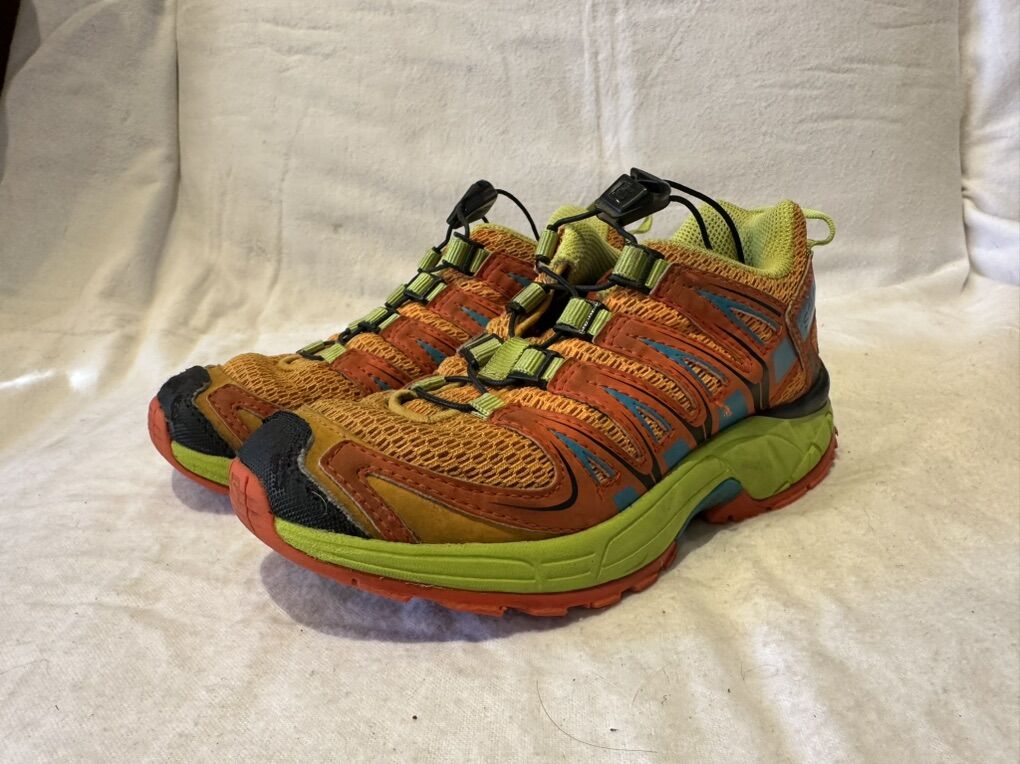 Salomon toddler size 13 XA Pro orange with lime green accents and corded laces trail shoes. These are in good condition, and see photos for details. I take cash or Venmo, but cash is preferred. Text is best. 8012014446. Check out my other ads for additional sizes and styles.