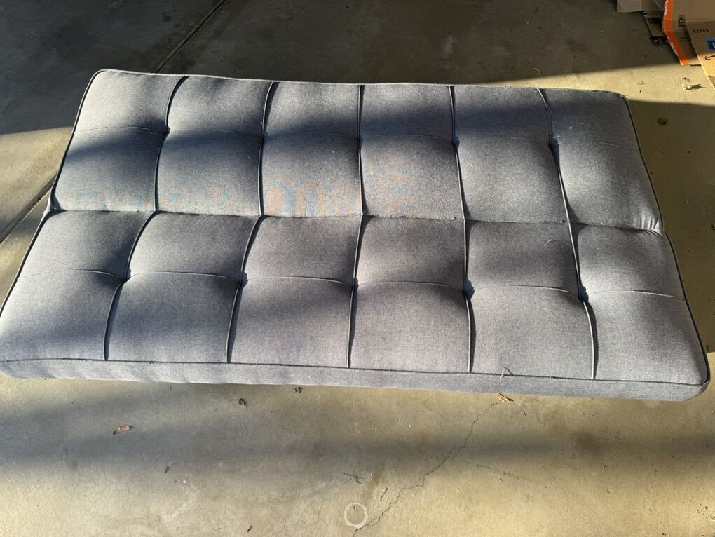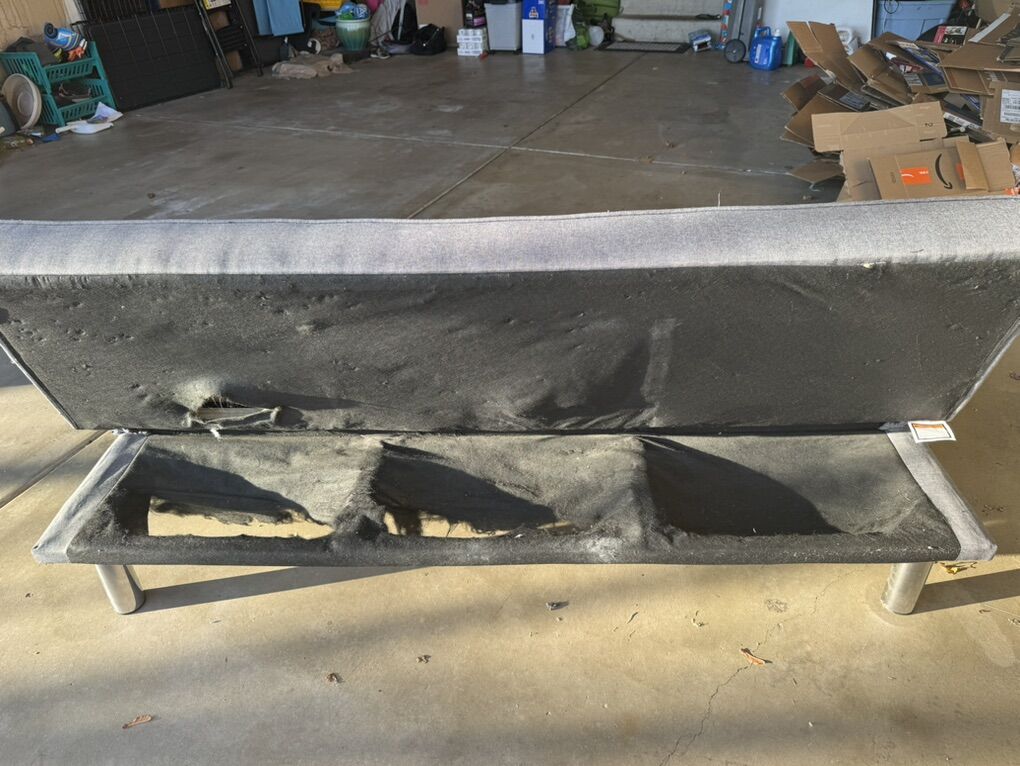 VenmoGray futon, about 7 years old. It’s clean and fully functional. Small visible tear in left corner. Tears in the back and underside, but it’s not visible when against a wall and doesn’t actually serve a purpose. Asking $50 or best offer.