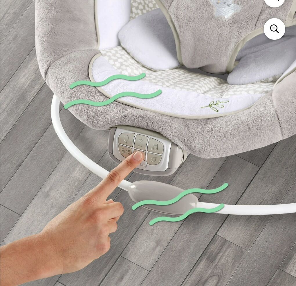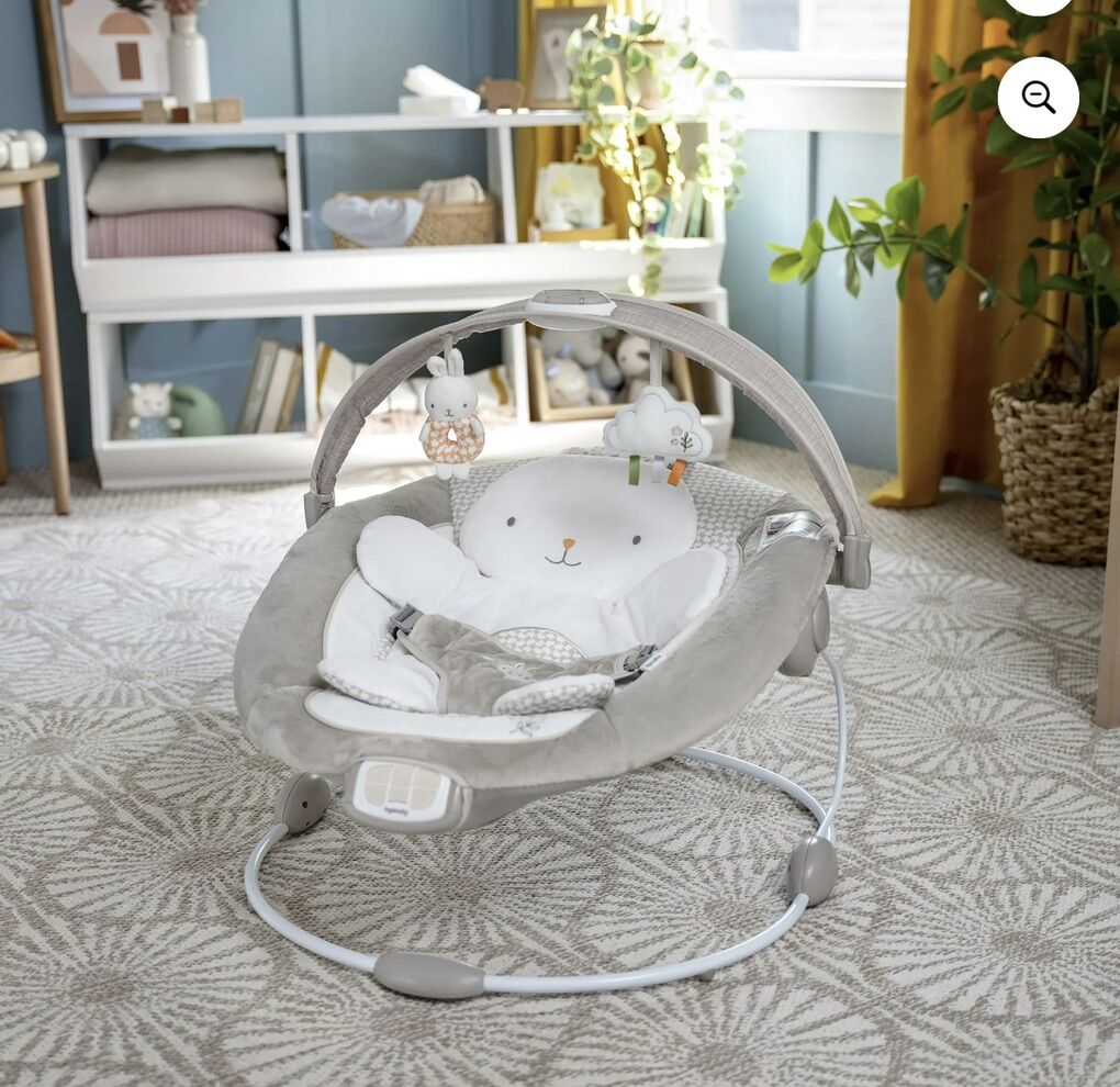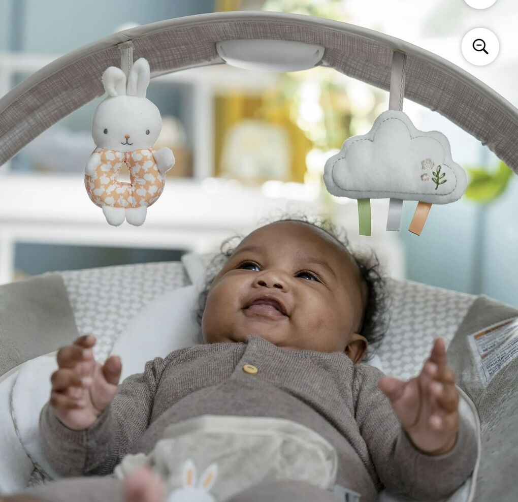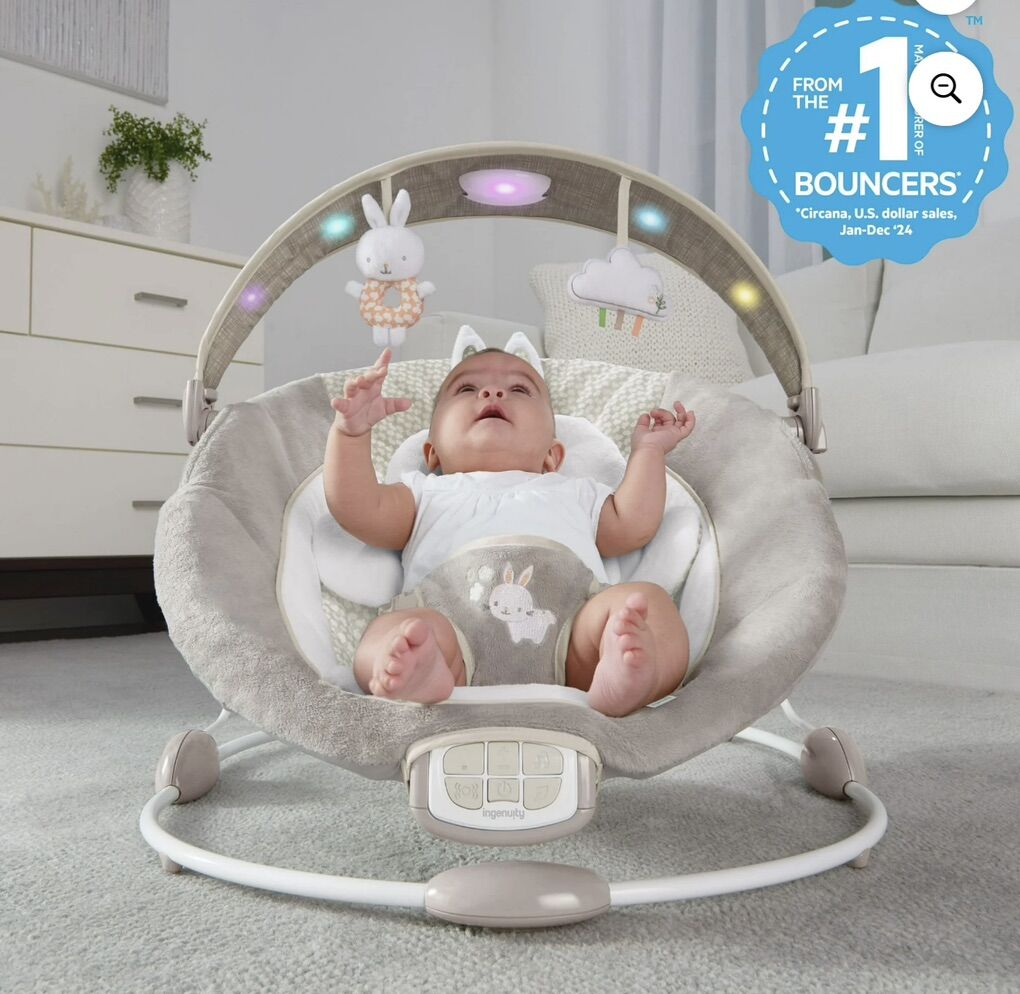 ApplePayThe InLighten by Ingenuity Twinkle Tails Bouncer is a second set of hands for busy parents, with plush fabrics to keep baby cozy calm. For newborns to 6 months or up to 20 lbs • Use the cozy bunny bolster to give newborns extra support comfort. Remove bolster to use as a tummy-time mat • Includes removable light-up overhead toy bar for engaging 2 hanging plush toys for practicing reaching grasping; Baby bouncer makes great gift for holidays baby showers • Soothing vibrations, calming melodies, nature sounds white noise with volume control auto 30-minute shut-off. Powered by 3 size C batteries (not included) • Safe convenient design includes 3-point harness to keep baby secure Machine washable seat pad bolster for easy cleaning