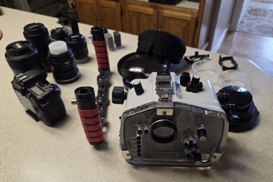 Ikelite 200DL Housing w/vacuum port and strobe sync port - $1995 new Ikelite 8" dome port - $495 new Ikelite 3" flat (macro) port - $375 new Dual Tray - $150 new Ikelite focus gears x2 Nikon D7500 body + 5 spare batteries w/charger - $695 new Nikkor (Nikon) 18-55mm 3.5 AF-P lens - $100 new Nikkor (Nikon) 70-300mm 4.5 AF-P lens - $319 new Nikkor (Nikon) 40mm 1.2 AF-S lens - $246 new Nikkor (Nikon) 105mm 2.8 AF-S lens - $387 new Tokina SD 11-16mm 2.8 IF DX II lens - $429 new $5200 value new, asking just $2000!