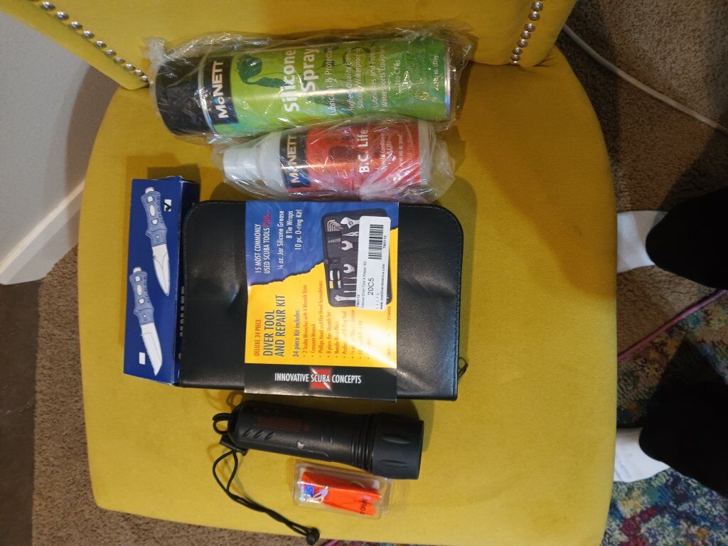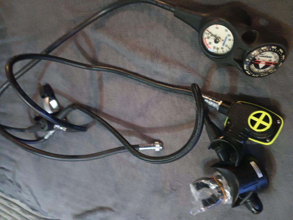 Large Neo sport 2 piece scuba wet suit (NEW) Large Mars pegasus diving vest used 3 times. Oceanic regulator pkg. Aqua lung regulator Neo sport diving boots size 11 Extra weight belt with weights Diving accessories Knife, flashlight, diver tool repair kit, silicone spray and BC conditioner and cleaner Tank $650.00 or best offer