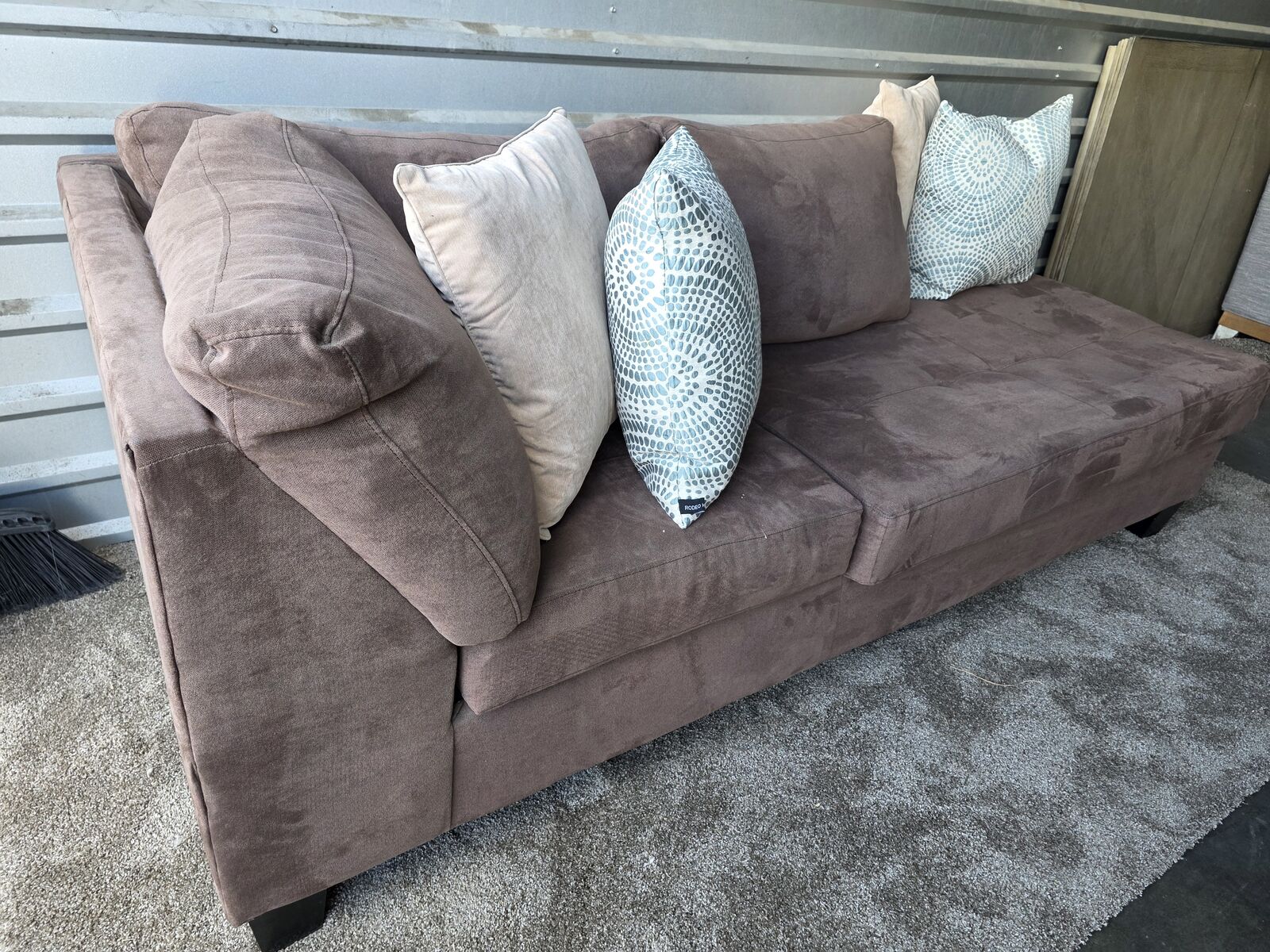 This beautiful modern chaise-style sofa is the perfect blend of comfort, clean lines, and warm color. It’s been very gently used and kept in excellent condition.