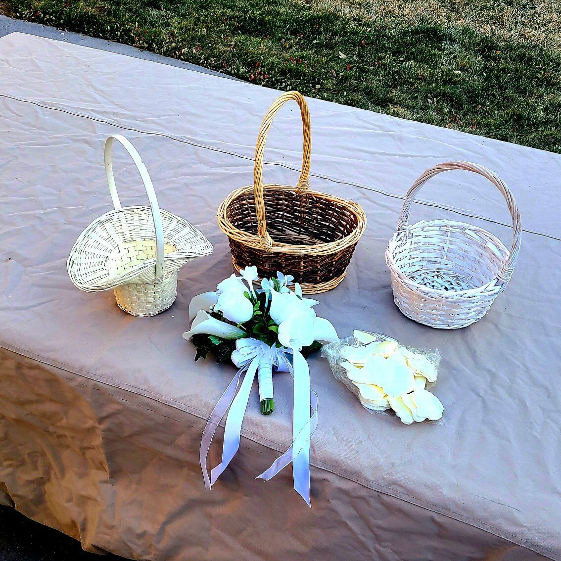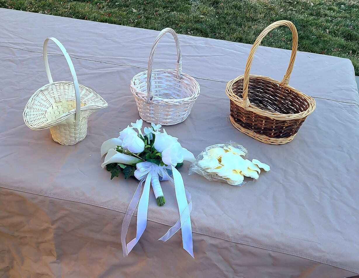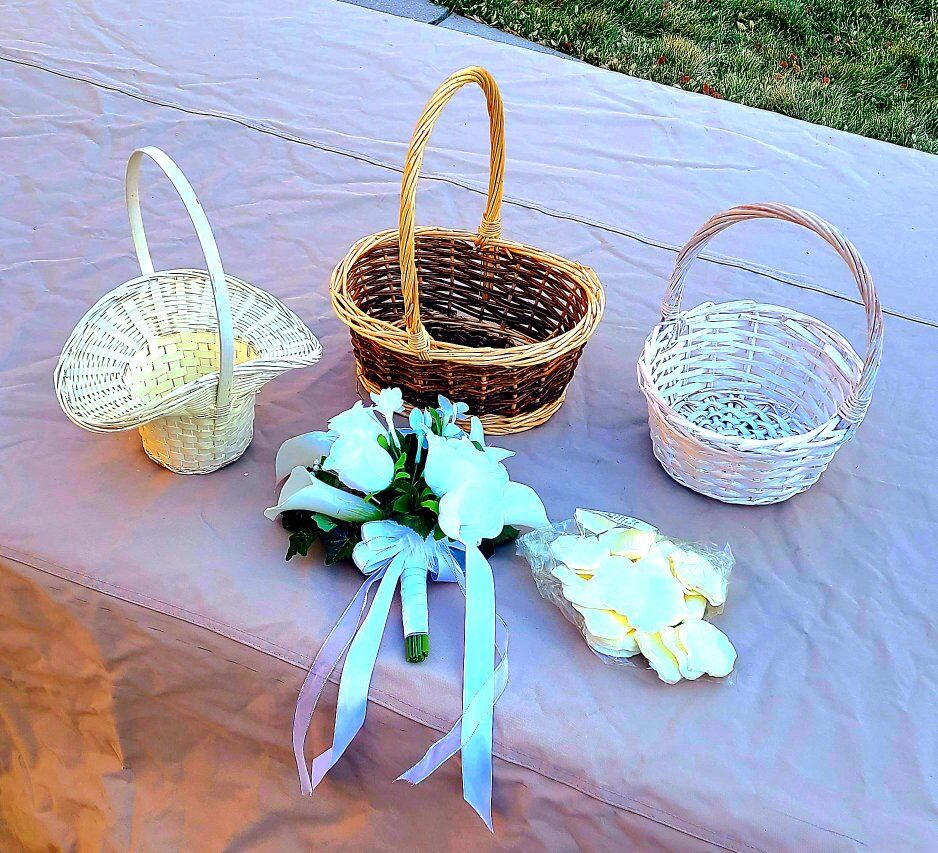 bag of new silk flower petals. 3 baskets 1 silk bouquet Everything included in the price.
