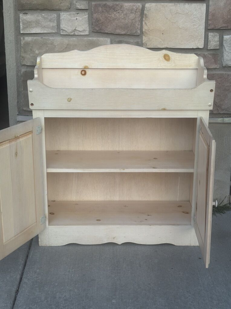 Charming wood cabinet. Has two doors with white knobs. Inside has two shelves. Top shelf area is good for display. Light wood finish with decorative edges.