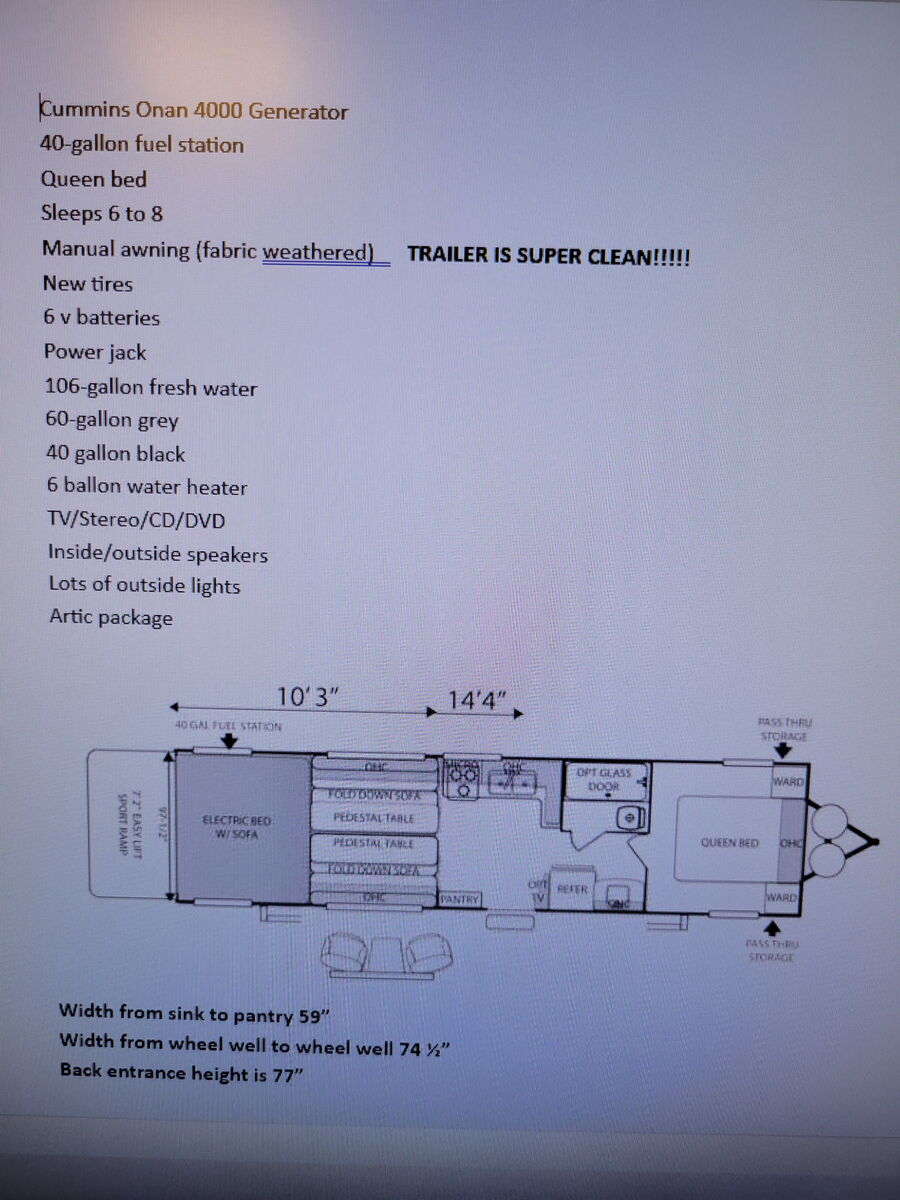 Bought a different style trailer and no longer need this one. This is maticulously maintained and everything works. Onboard Onnan 4000 generator has less than 100 hours. Factory installed rooftop solar panel. All new tires. Electric power jack. This unit is ready to go. Look at the pictures for all the details and options. PRICED TO SALE!!!!