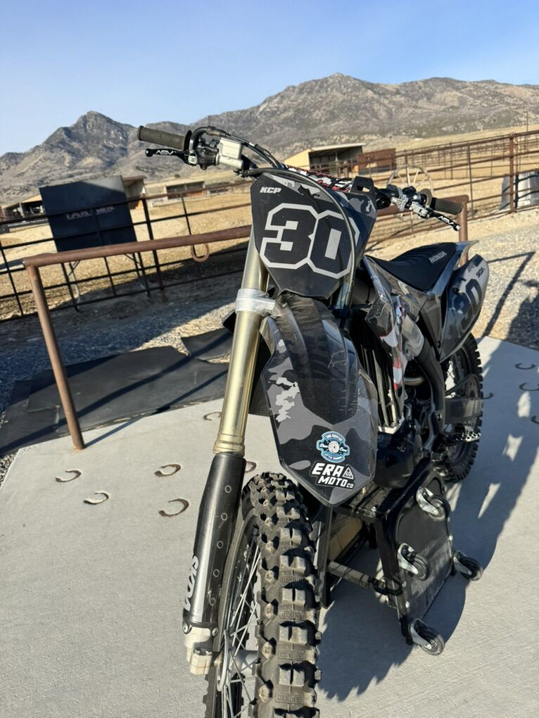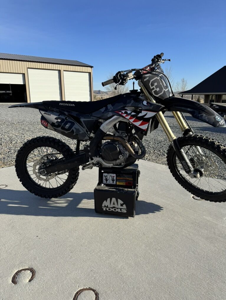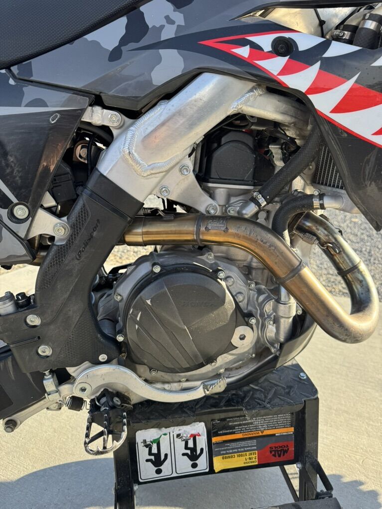 2020 CRF450R •Dual yoshimura RS9 tail pipes with stainless steel head pipe •Black plastics and SKDA graphics •ASV break away levers •Polisport frame and swing arm guards •Dcor grippy seat cover I’ll also be sending another black wheel with it that someone can put a paddle tire on. The bike has 135 hours no rebuild, it’s ran so great that it hasn’t given any indication that it needs a rebuild