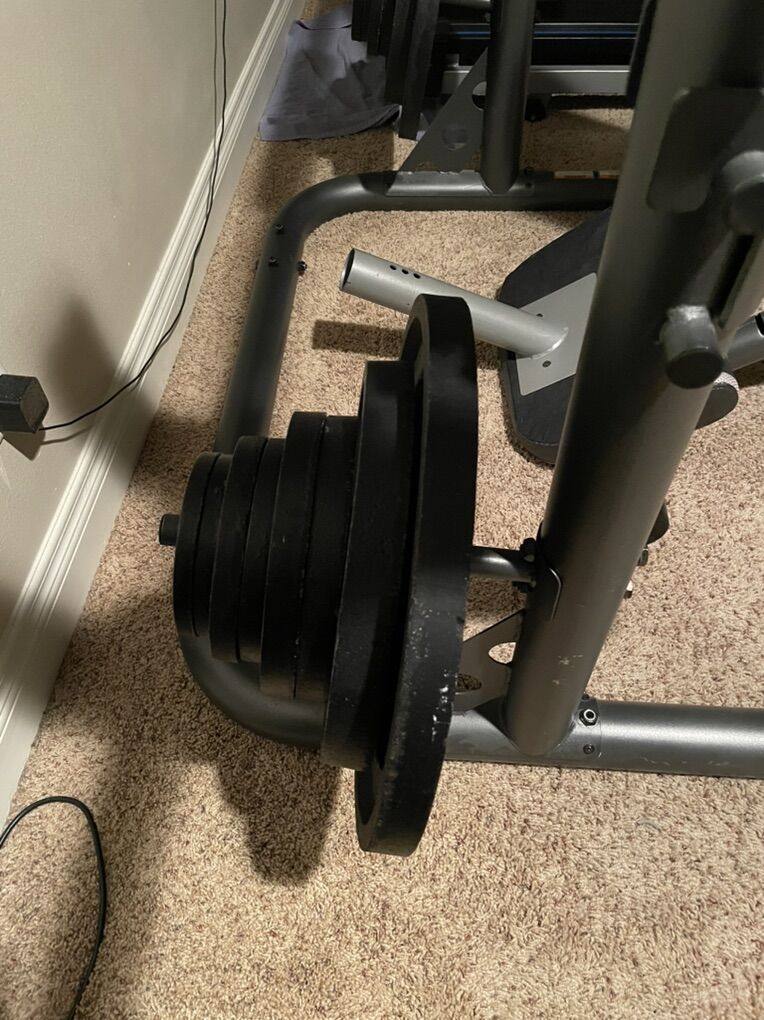 45# Olympic bar 2-44# 2-33# 2-22# 2-11# 4-5.5# 4-2.2# Rack and Bench (inclines and Declines. Weights can be stored on rack. Safety bars for benching by yourself