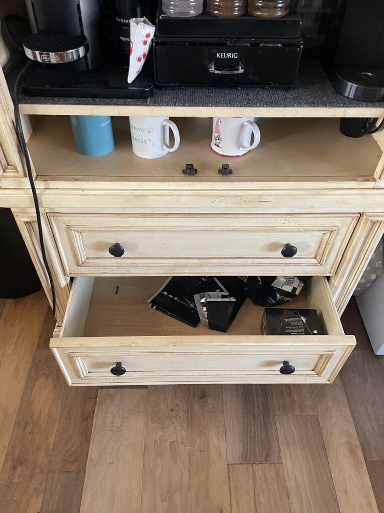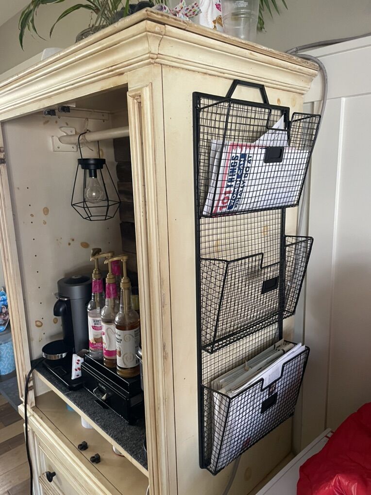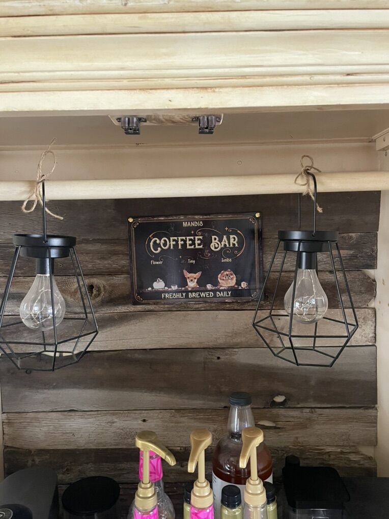 ApplePayCream colored weathered with wood slat inlay backsplash. Vintage hanging lights powered by battery. 2 drawers for storing coffee, pods, extra cups, etc. armoire has 2 doors that can be installed.