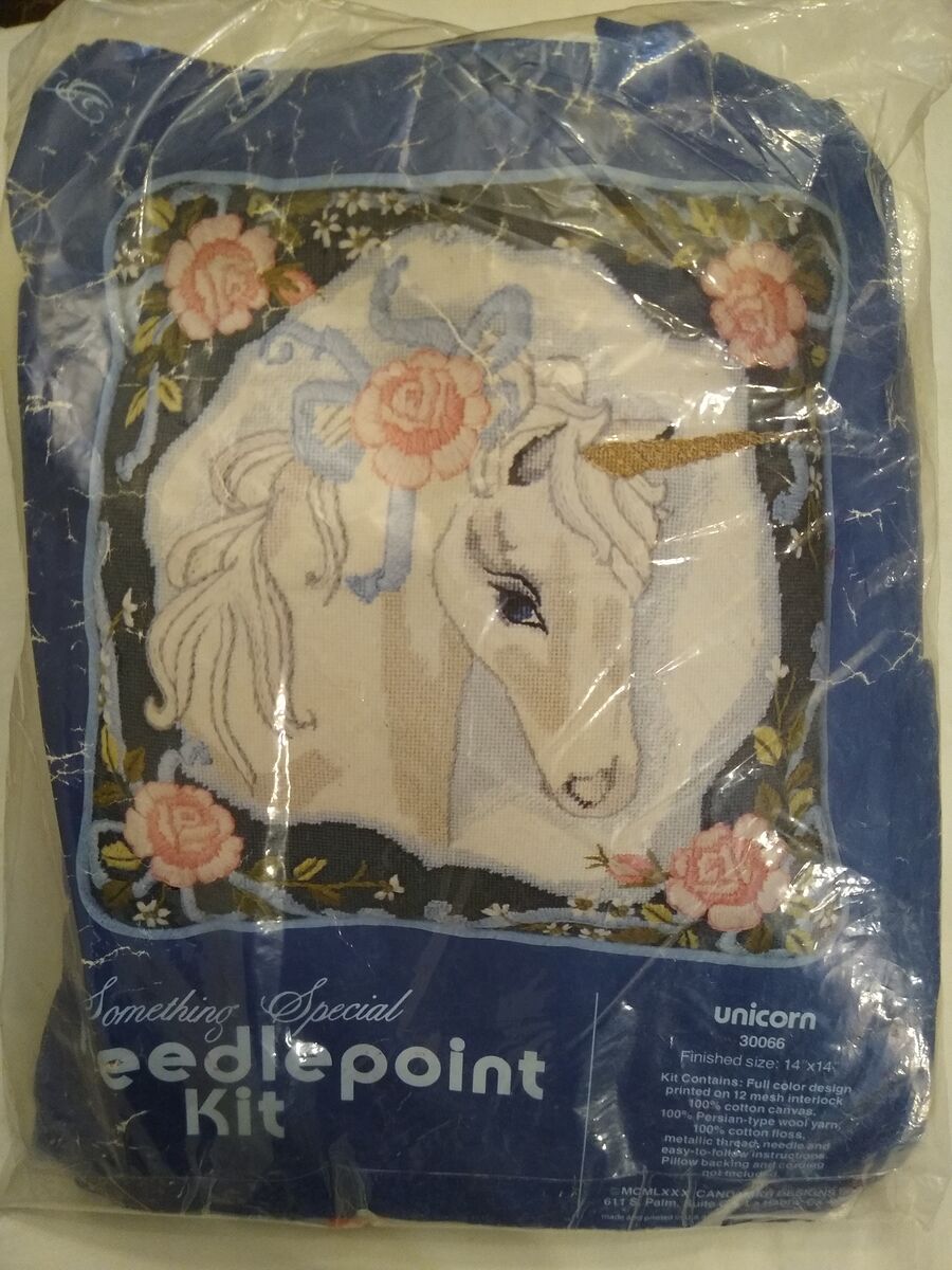 Needlepoint kit to make a unicorn picture or pillow. Includes cotton canvas mesh, wool yarn, needle and instructions. Measures 14" x 14". The packaging is worn but it is new and never opened. All components are there. Candamar Designs, Inc. – Something Special brand kit #30066 from the 1980's. Please see our other listings for more crafting items. Smoke-free home. Cash only please.