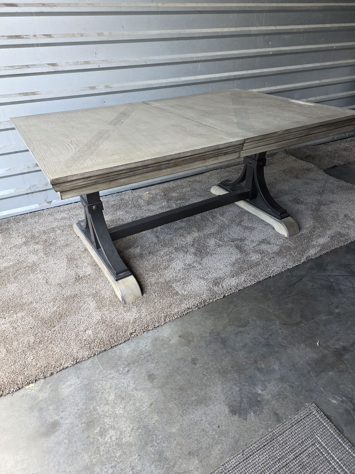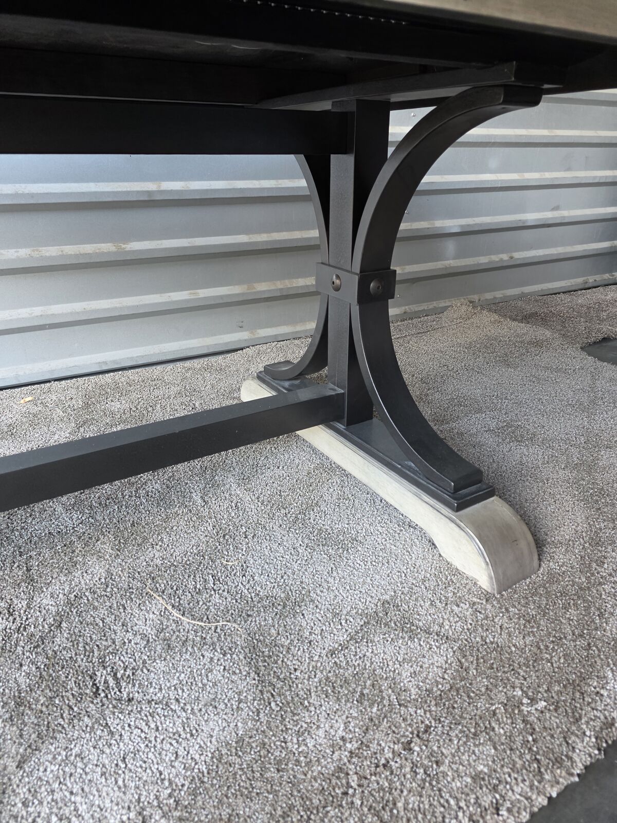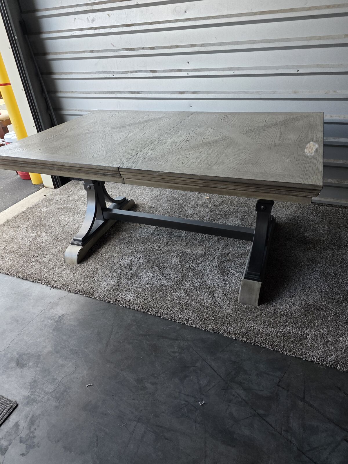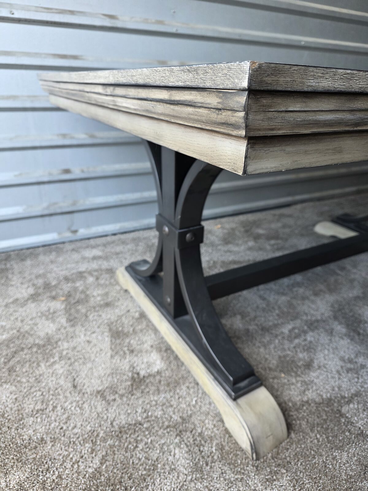 Selling a solid, high-quality dining table with a beautiful weathered gray wood-look top and a bold black trestle base. It has that rustic-modern / farmhouse transitional vibe.