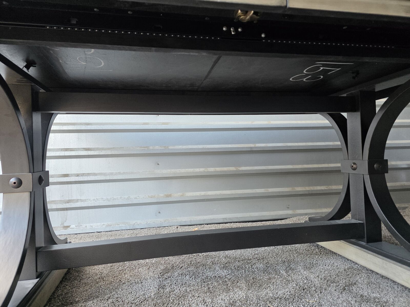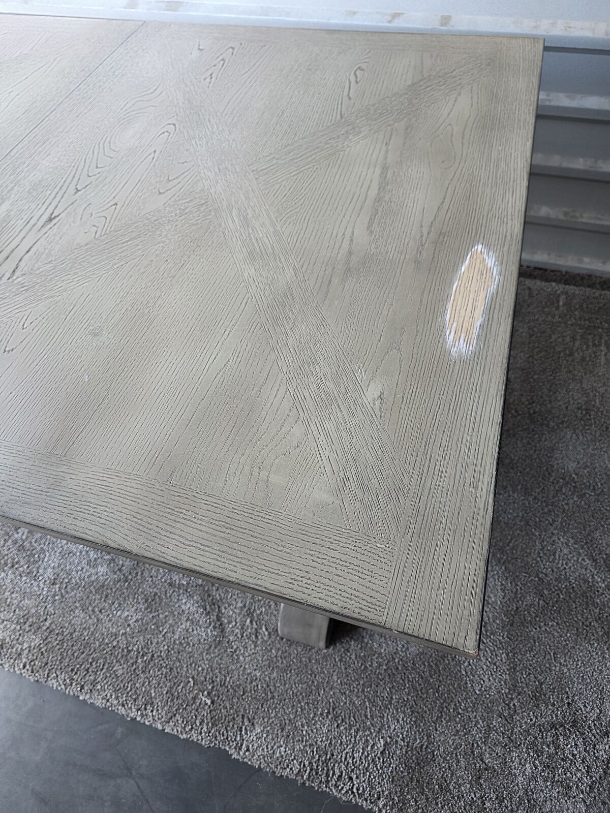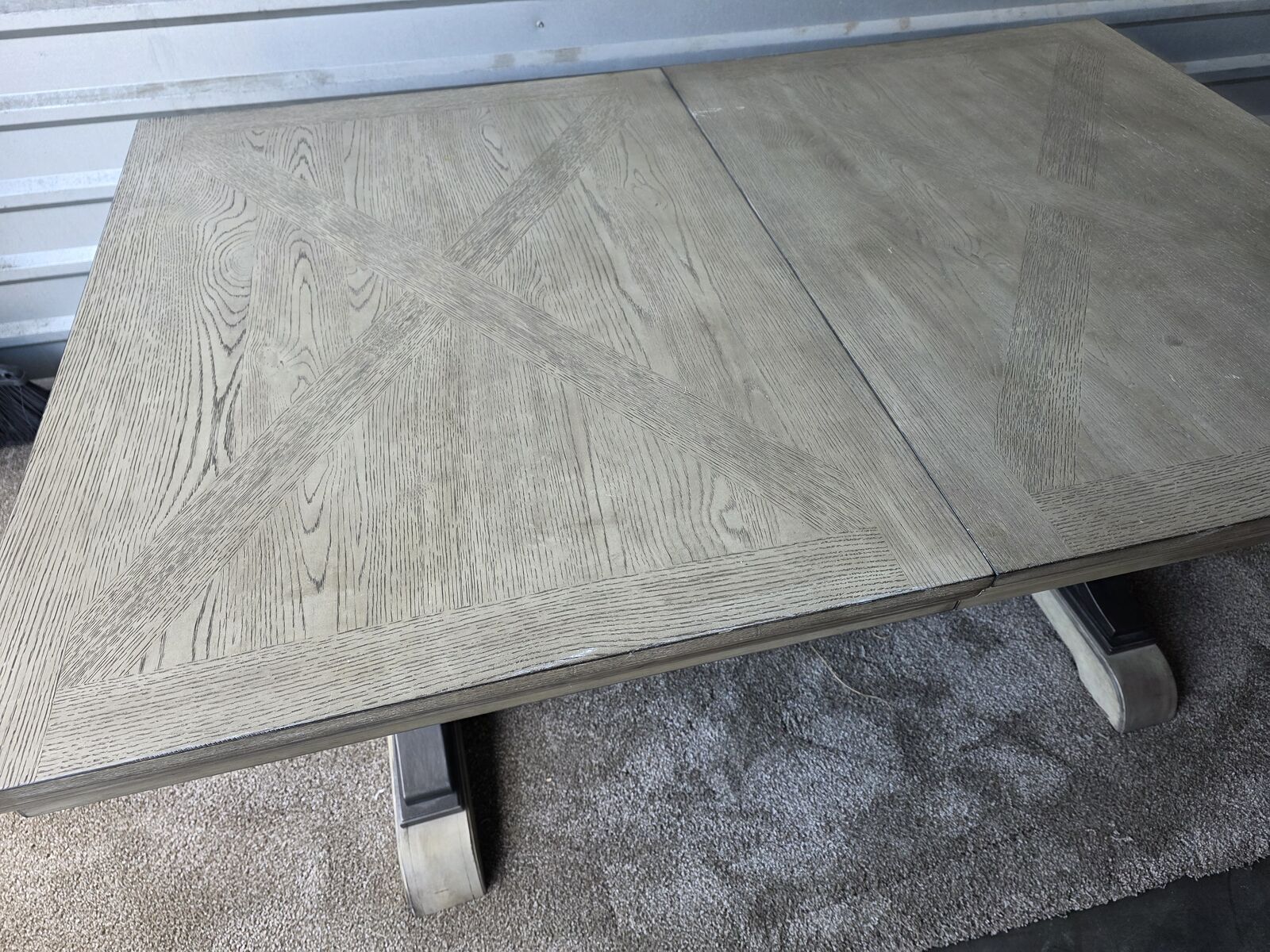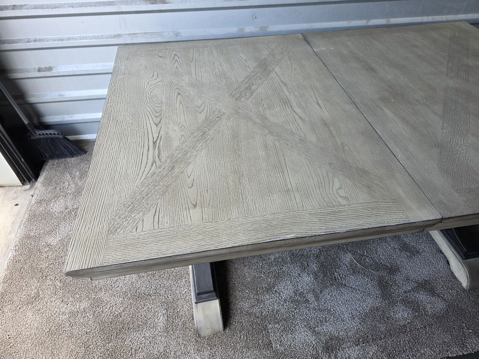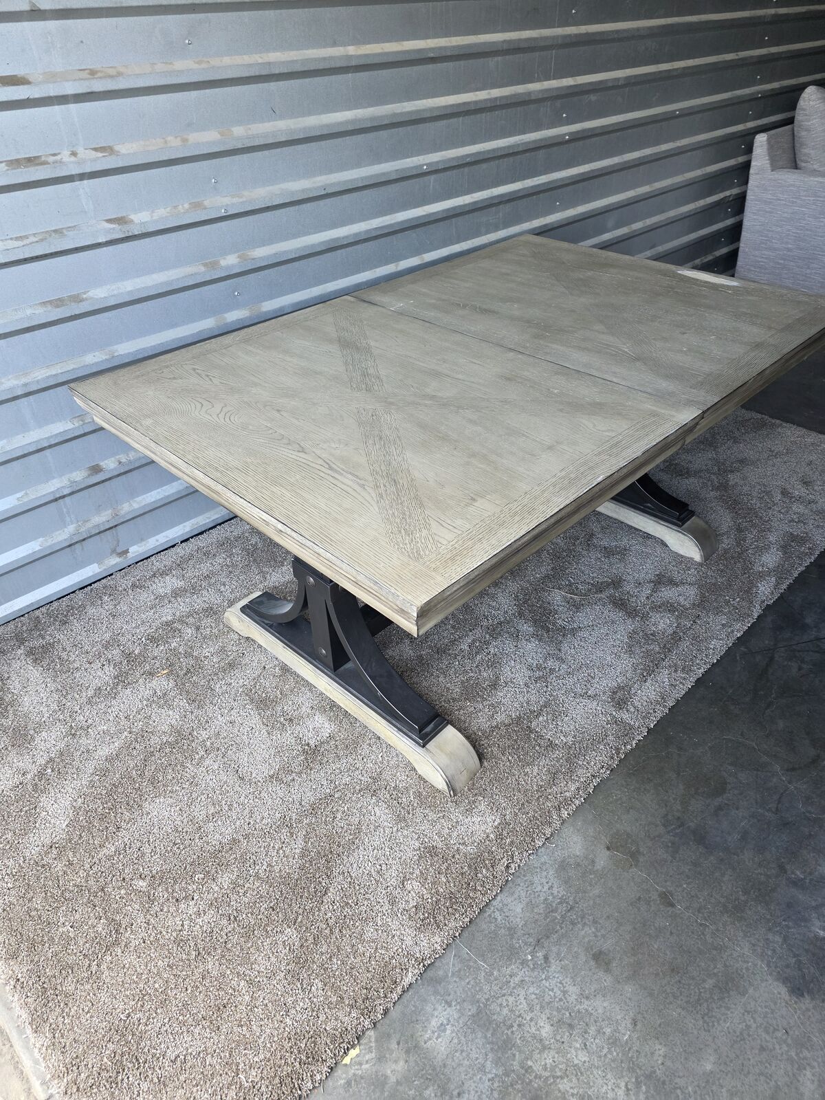 Selling a solid, high-quality dining table with a beautiful weathered gray wood-look top and a bold black trestle base. It has that rustic-modern / farmhouse transitional vibe.