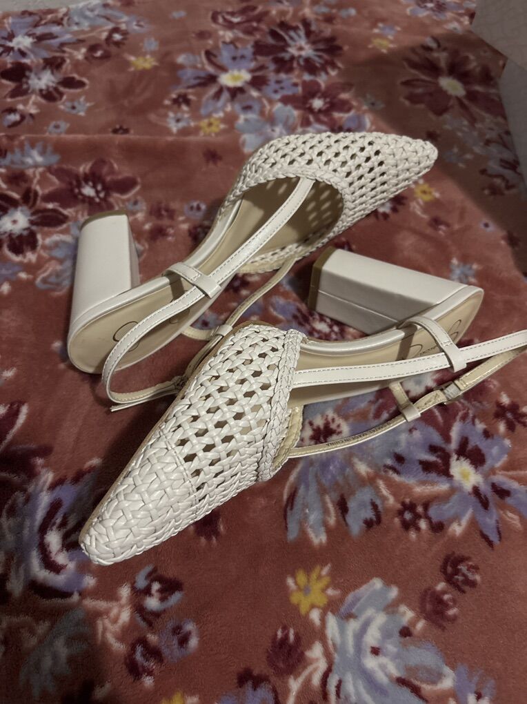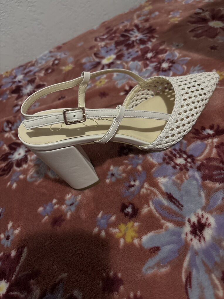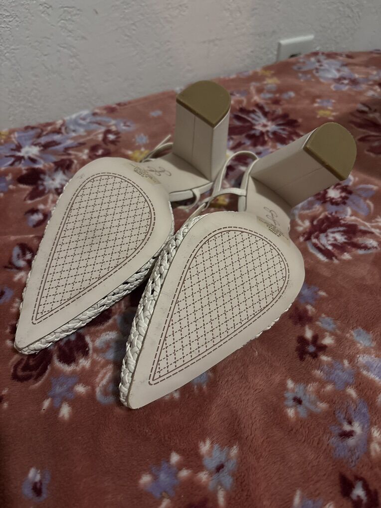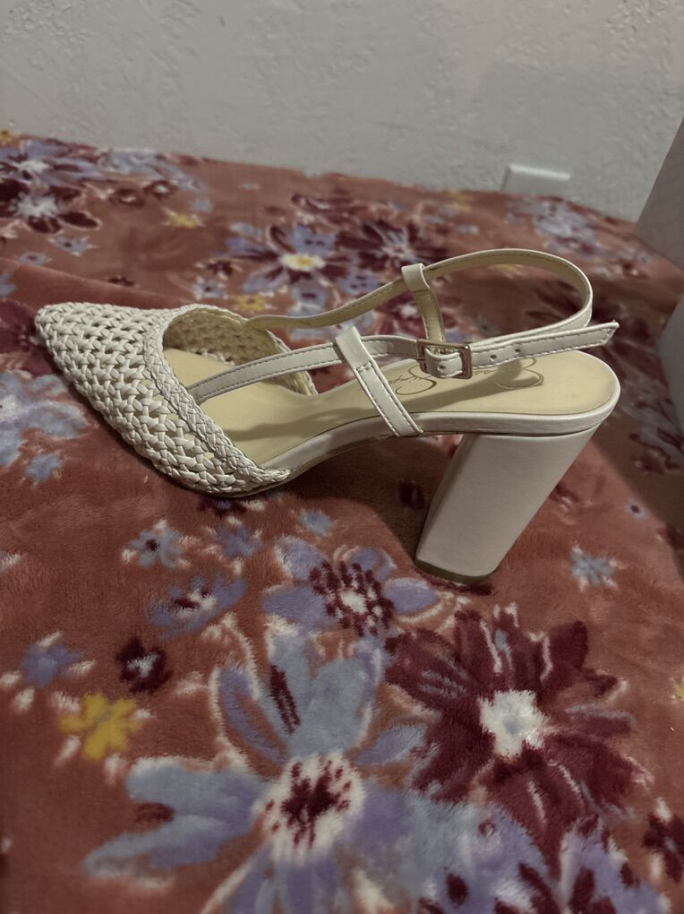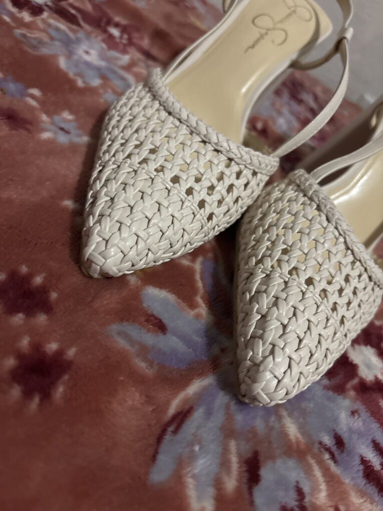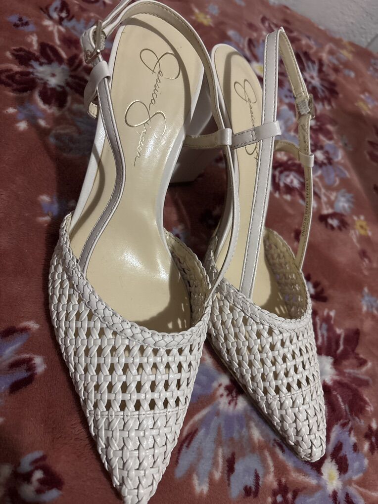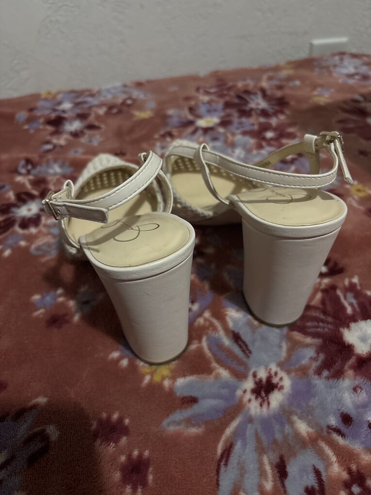 ZelleElegant cream heels by Jessica Simpson woven pattern, a stable block heel, pointed toe for engagement photos Perfect for wedding bridal shower beach casual etc. Size 9.5 no box excellent condition worn one time for an hour indoor dress try on. Asking 10.00 Message or text Melissa 801-603-8373. I prefer cash but can take Venmo or Zelle. Check out my other items I have listed pick up only for all items!