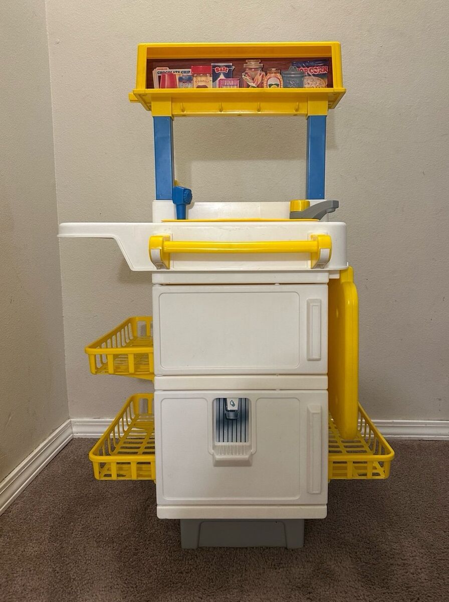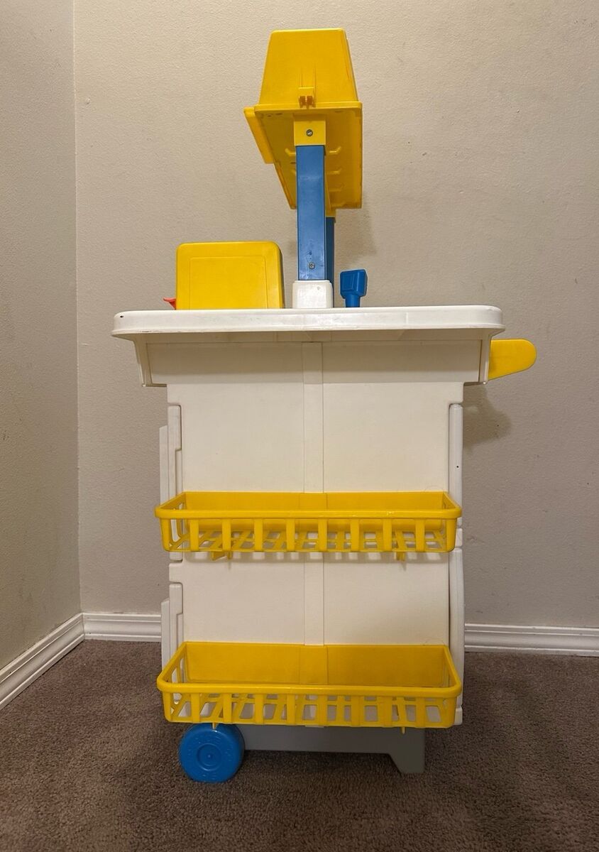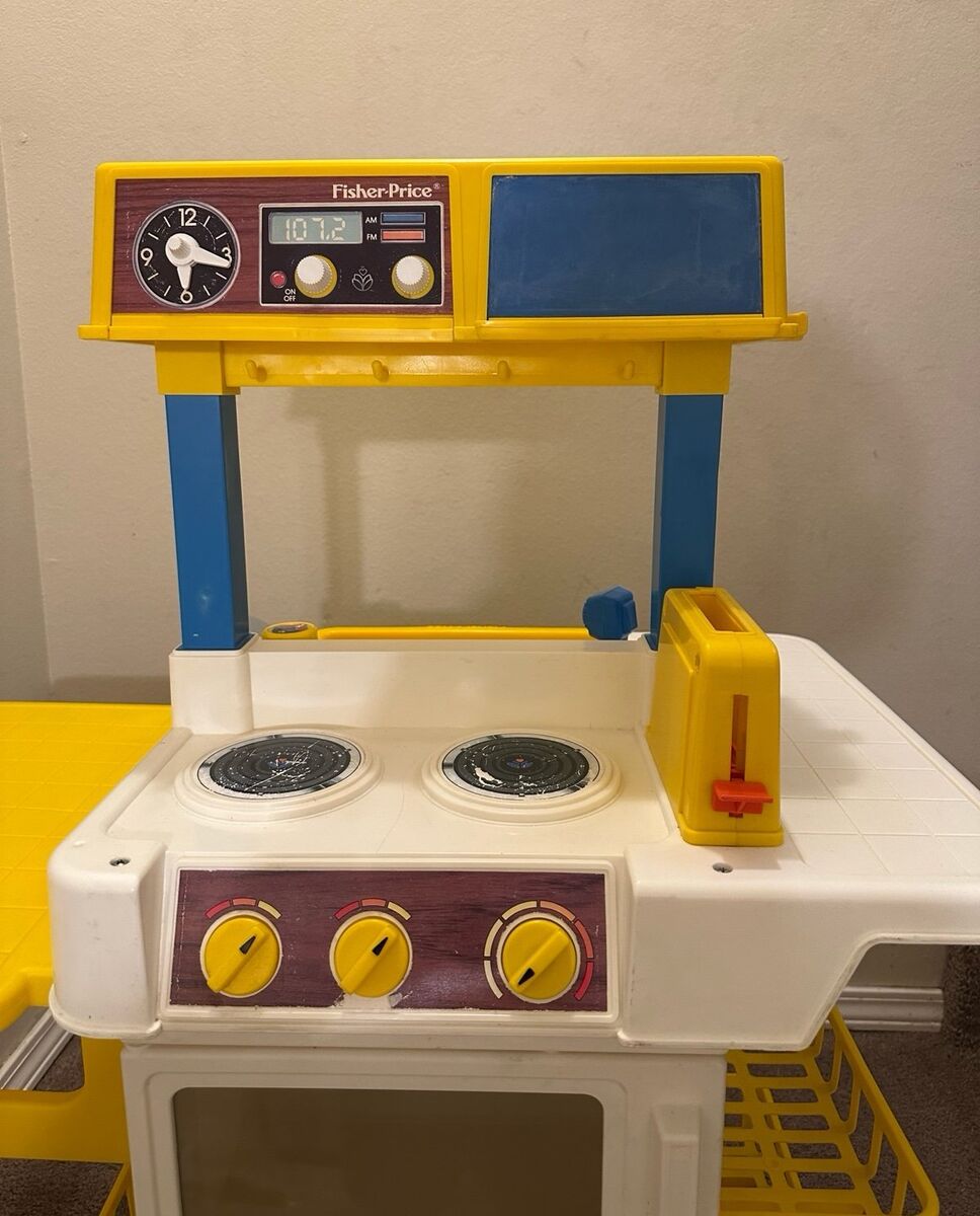 Vintage 1970s Fisher Price Fun Food Kitchen Oven Play Set with a classic pretend kitchen with oven, stove, and sink. This retro Fisher Price play set includes turning stove knobs, oven with window, sink area, storage cabinets, side baskets, and the iconic yellow, white, and blue design from the 1970’s / 70’s toy era. A fantastic vintage pretend food kitchen for imaginative play, playroom styling, homeschool spaces, or collectors of classic Fisher Price toys. These older Fisher Price kitchen play sets are known for their durability compared to modern plastic kitchens.