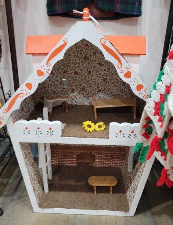 This is a one-of-a-kind, handmade Swiss Chalet–style dollhouse, crafted from solid wood and hand-painted with care and detail. The quality is immediately apparent — from the sturdy construction to the thoughtful decorative touches throughout.