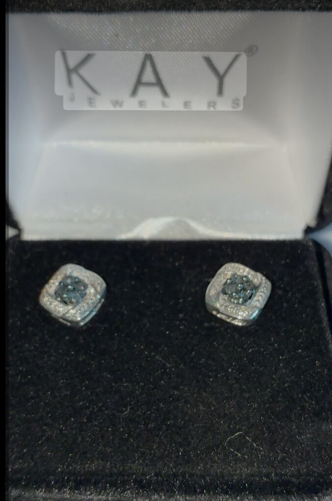 ApplePayblue and white diamond stud earrings in a cushion or square shape, set in sterling silver. They feature a cluster of blue diamonds surrounded by a halo of white diamonds. 3/8 carat