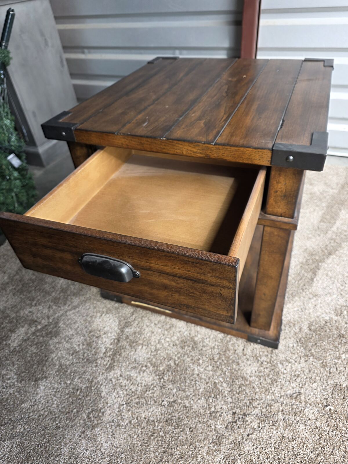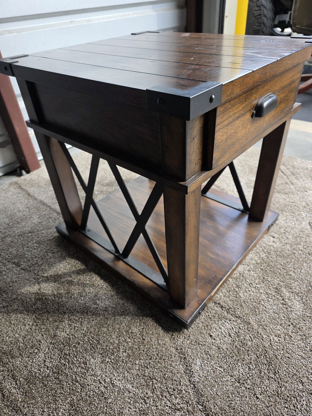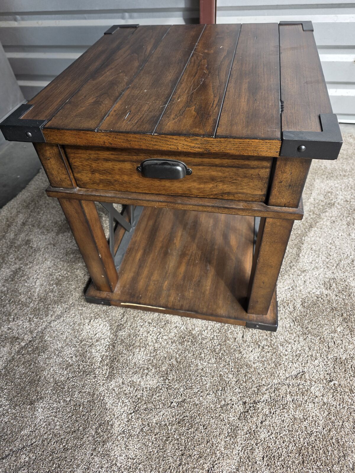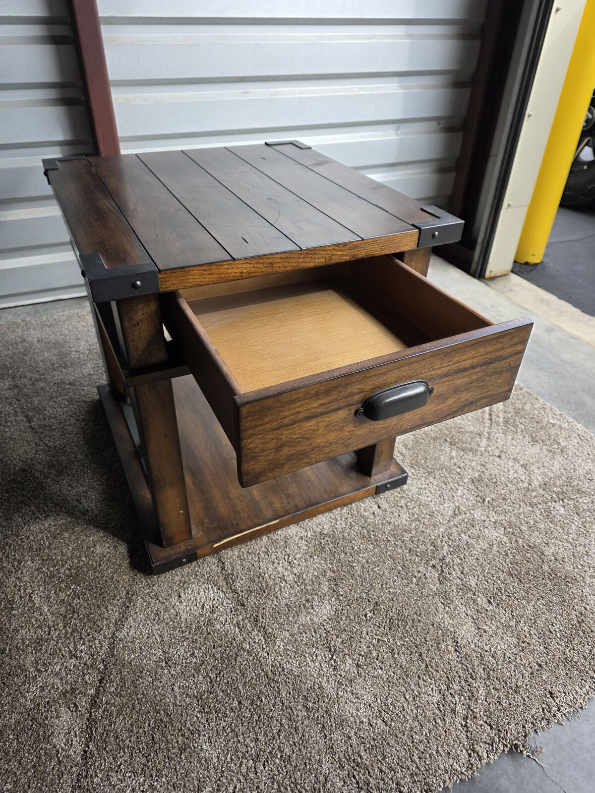 The top features a plank-style wood surface with metal corner brackets that give it that handcrafted, vintage touch. The drawer slides smoothly and is perfect for storing remotes, chargers, candles, notebooks — anything you want tucked away. The bottom shelf offers extra room for décor, baskets, or books, making the table both stylish *and* functional.