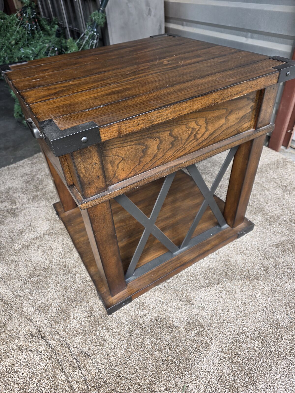I'm selling this gorgeous rustic vintage end table that blends warm wood tones with sturdy black metal accents. It has a clean, timeless look that fits beautifully in modern farmhouse, cabin, industrial, or transitional spaces.