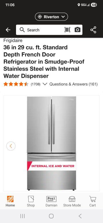 Frigidaire 36 in 29 cu. ft. Standard Depth French Door Refrigerator in Smudge-Proof Stainless Steel with Internal Water Dispenser.