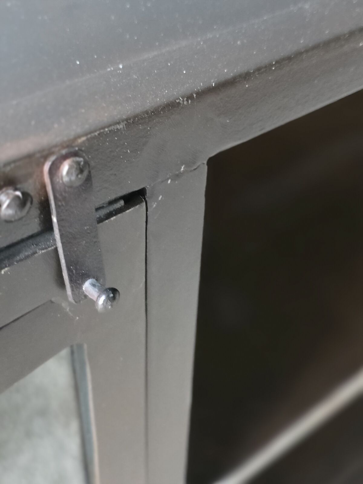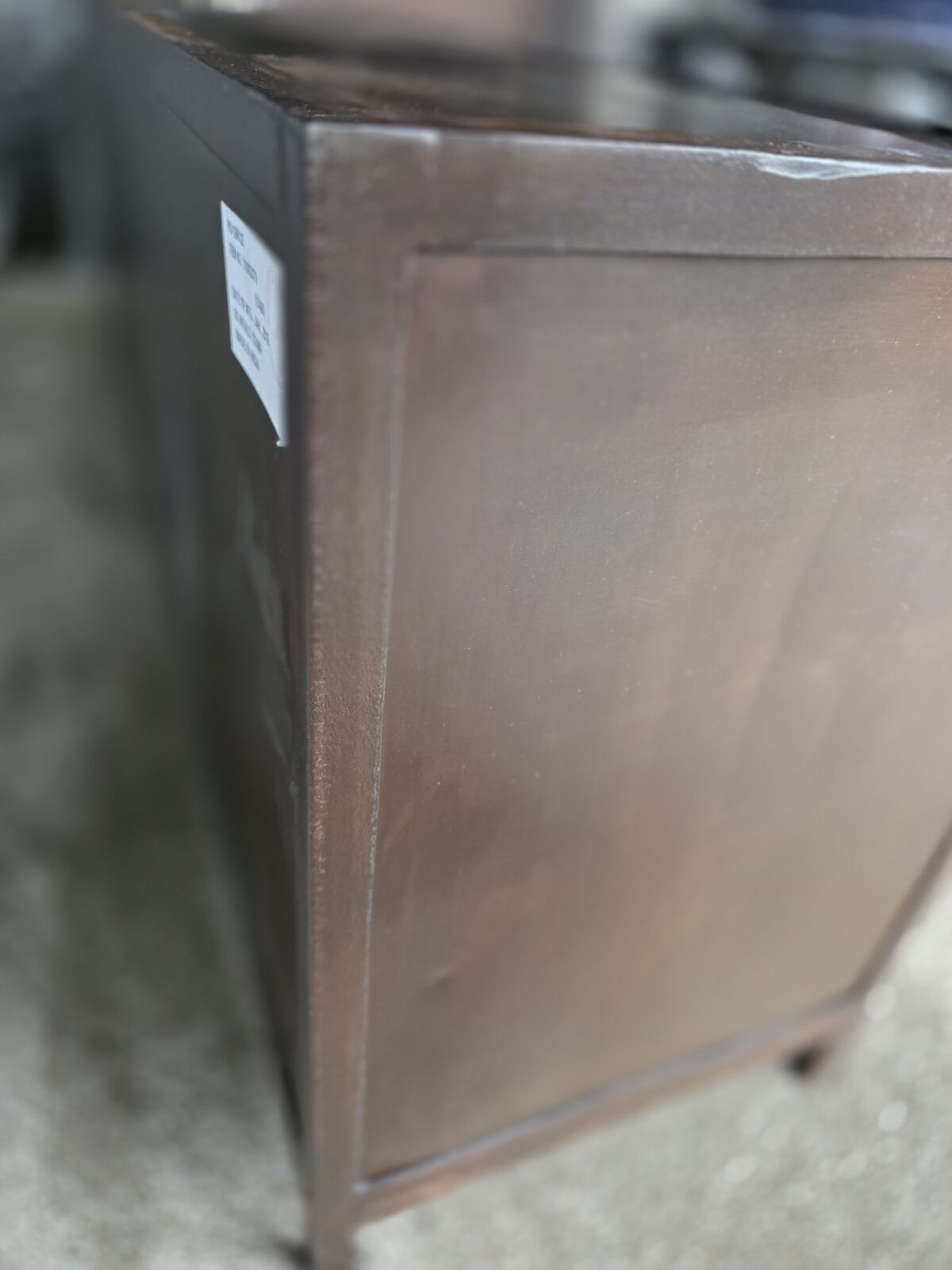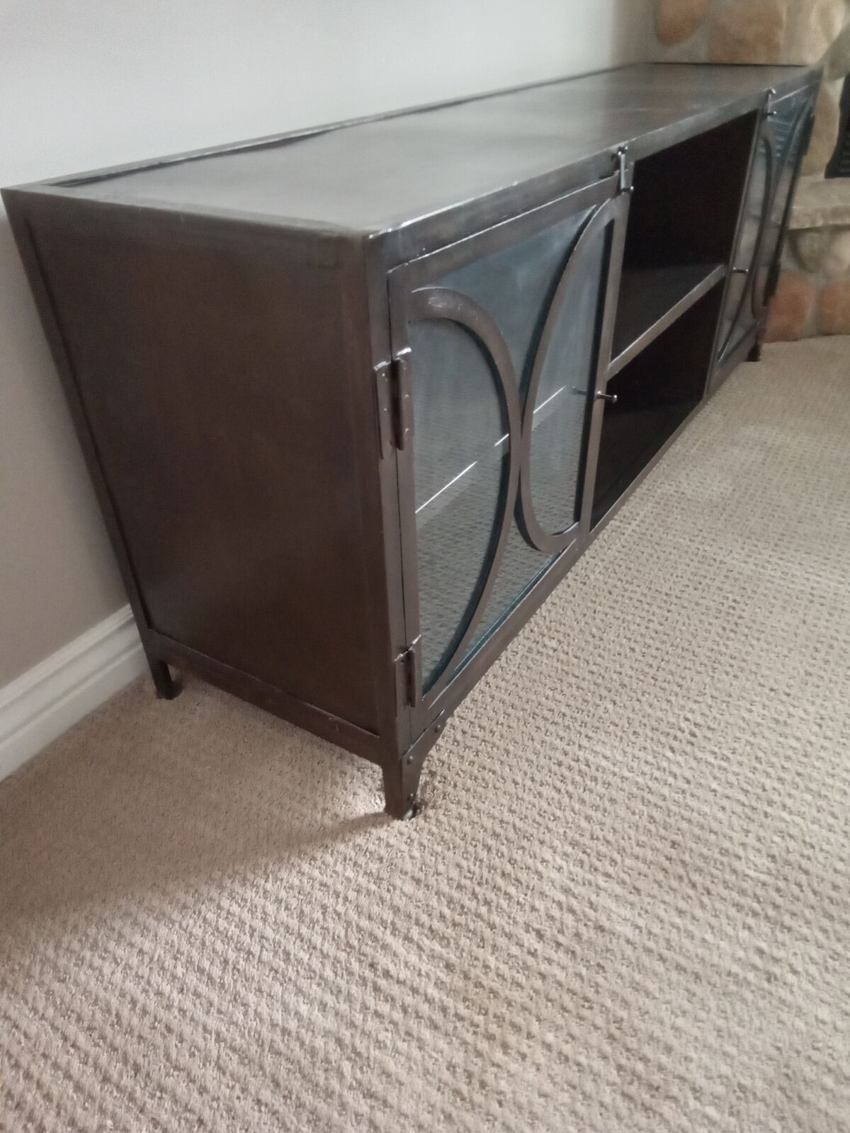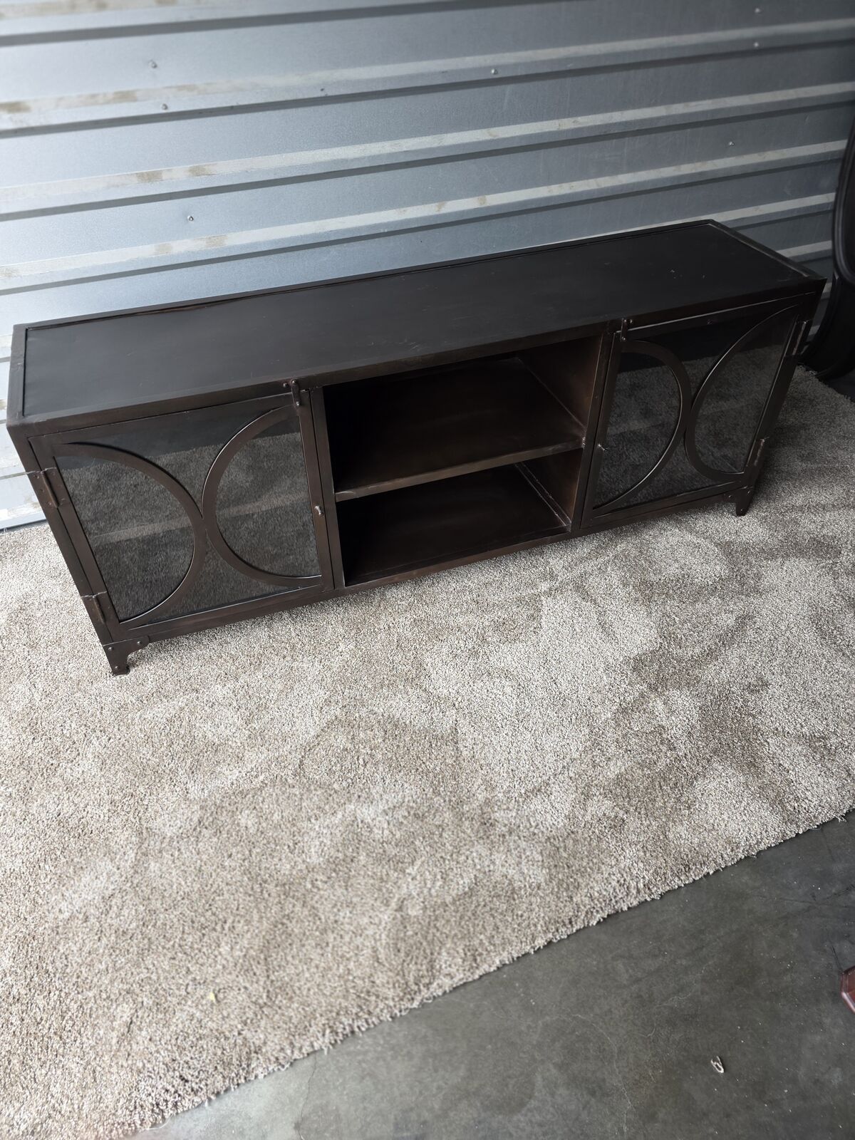 Unique, hand crafted imported console credenza made with a crafted metal frame/body and glass inset doors in a rich espresso / bronze tone finish.