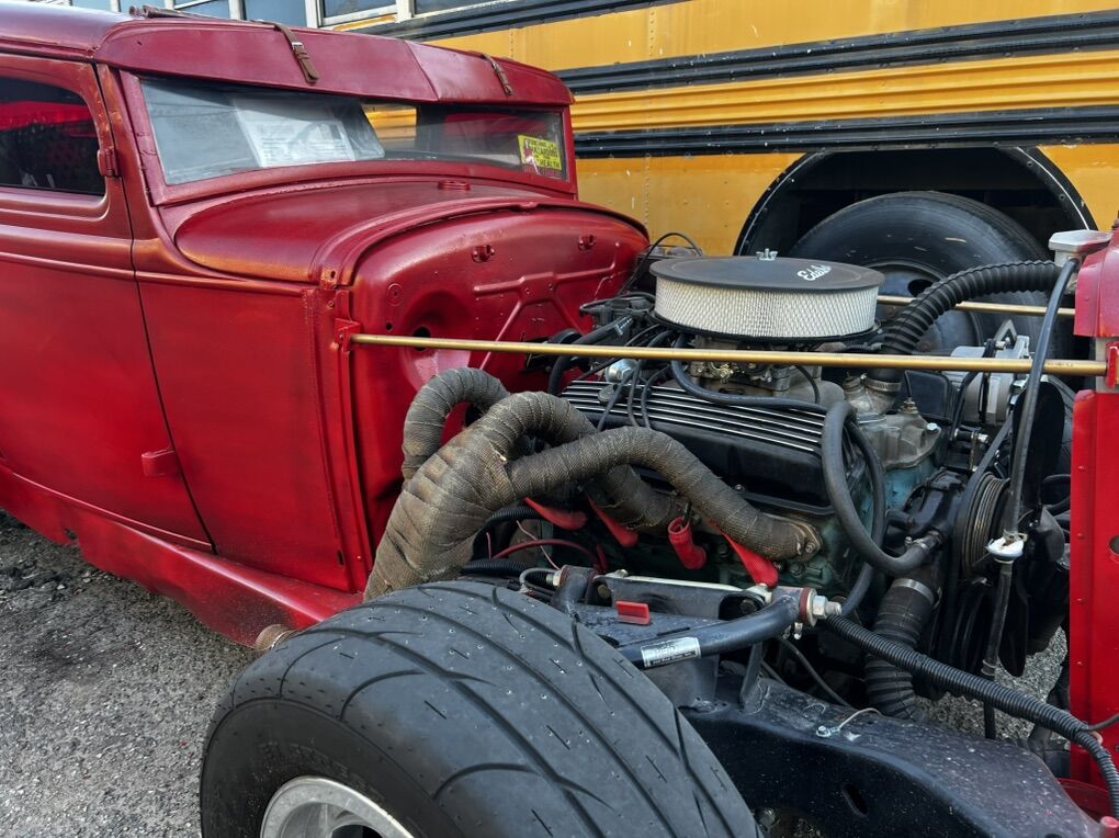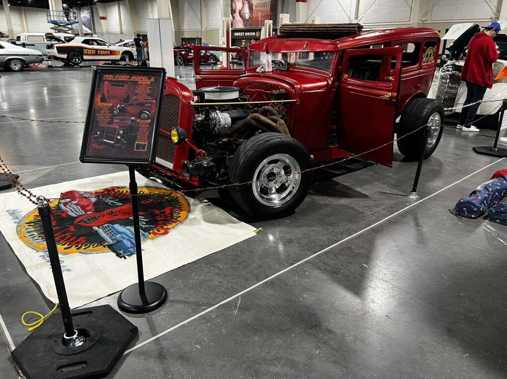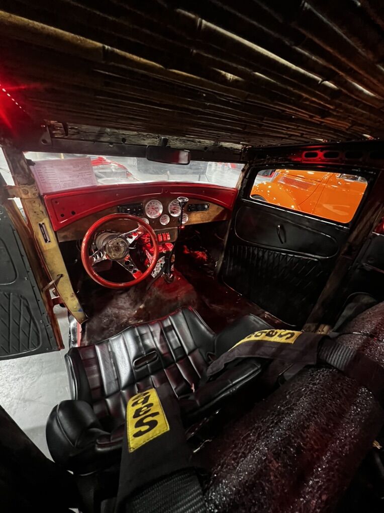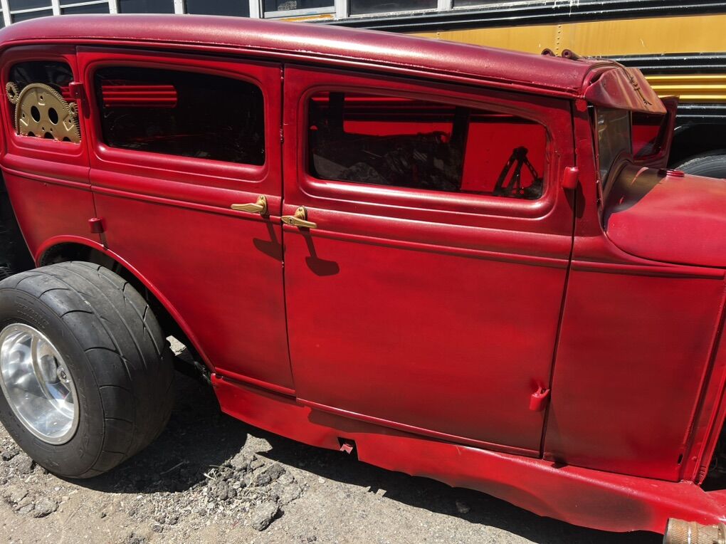 one of a kind 1931 model A 4 door Dash signed by Trixie Roth (RATFINK) Chopped top Rear doors are welded shut Bamboo rollback roof Cowhide rug interior Kirkey seat Kirkey seat cover Brand new tires Polished wheels New paint Red plexi windows Toggle switches control power, fuel, acc, push to start. 4point harness belt Headlights Tail lights Pill tank Semi Caged interior Custom rear wing AVS 2 carb ( could use some small tuning) Matching Valve covers and air cleaner Wrapped headers Front splitter Custom fab. Alt bracket New alternator and alt belt Electric fuel pump And more