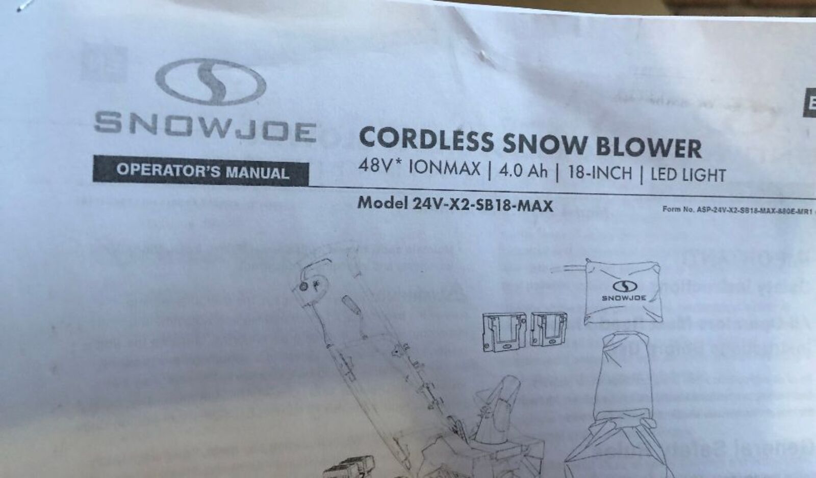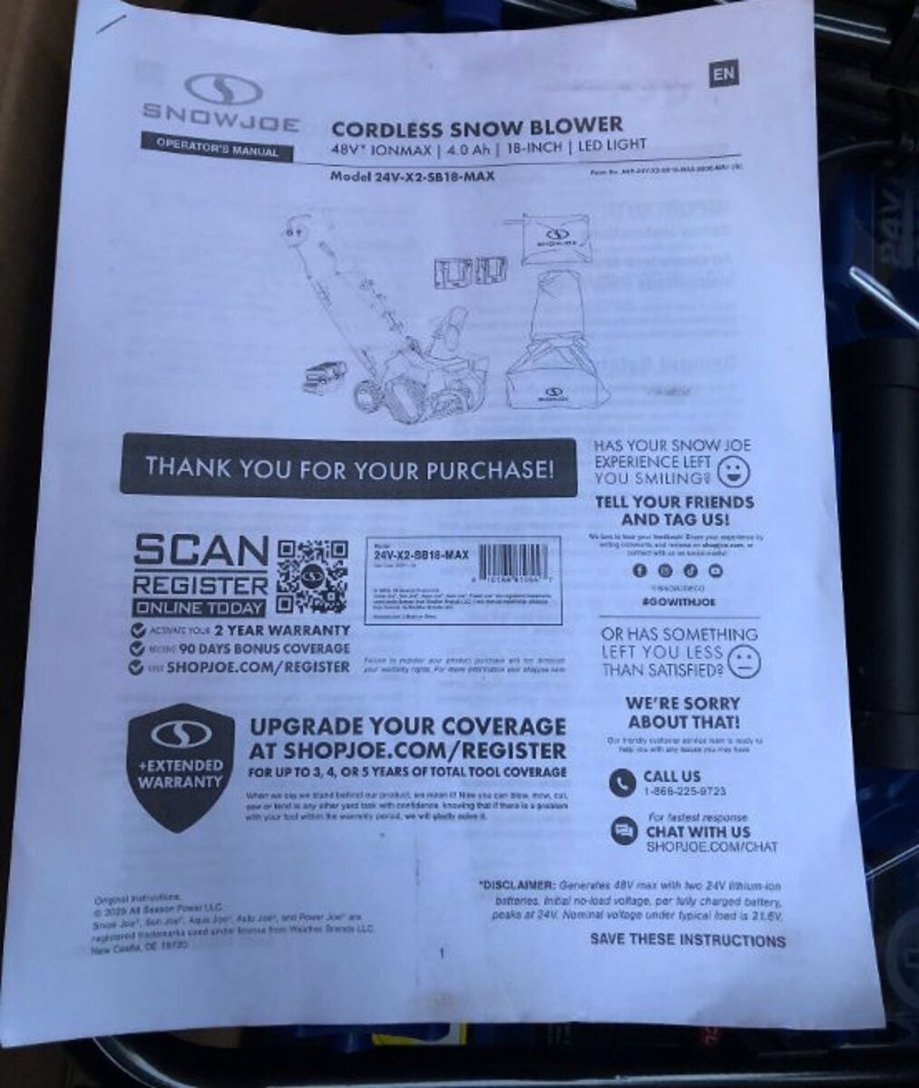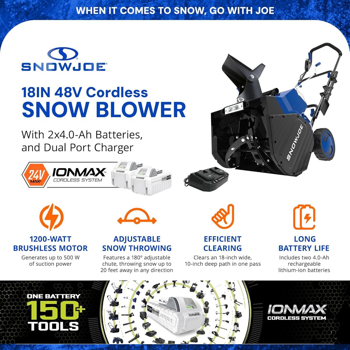 WHEN IT COMES TO SNOW, GO WITH JOE®. Meet the latest revolution in cordless snow-clearing technology: 24V-X2-SB18 IONMAX 48-Volt* 18-Inch Cordless Snow Blower from SNOW JOE®. Powered by Snow Joe’s exclusive IONMAX 24-Volt* lithium-ion battery system, the two included 4.0 Ah batteries with zero carbon emissions for cleaner air. Cut The Cord® with IONMAX cordless convenience to blast past the limits of an extension cord, and go anywhere power is at a premium. SNOW JOE clears an 18-inch wide by 10-inch deep path in a single pass. The powerful 1200-Watt brushless motor and the integrated scraper bar at the base of the unit clears right to the ground without damaging your deck, driveway or pavement. Put the powder precisely where you want it: SNOW JOE’s adjustable chute control rotates 180º to throw snow up to 20 feet away in any direction! And after dark, the integrated 2-Watt LED headlight lights the way for safer nighttime clearing. When there’s more work to be done, boost your battery power with even more IONMAX options online; or GET EQUIPPED® with a second set of IONMAX batteries, to keep throwing when it just won’t stop snowing! When winter strikes, fight back with 48-Volts* of snow-shredding power. 24V-X2-SB18 48-Volt* 18-Inch Cordless Snow Blower from SNOW JOE.