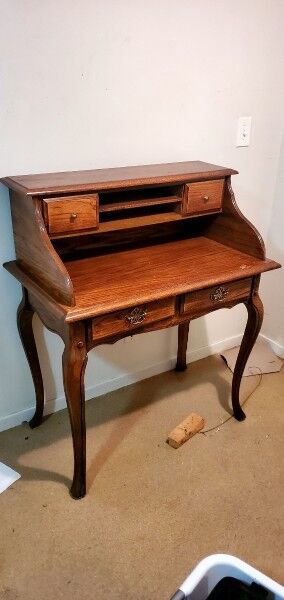 This Louis XV Style Secretary Desk in brown wood is a timeless and elegant piece of furniture. With intricate carvings , this desk exudes a sense of sophistication and old-world charm. It features four drawers for ample storage space and measures 23.5" in length, 45" in height, and 37.5" in width. The desk is a licensed reproduction from post-1950, making it a unique and authentic addition to any antique collection. Its sturdy construction and polished finish ensure durability and longevity, perfect for a secretary desk that will withstand the test of time.