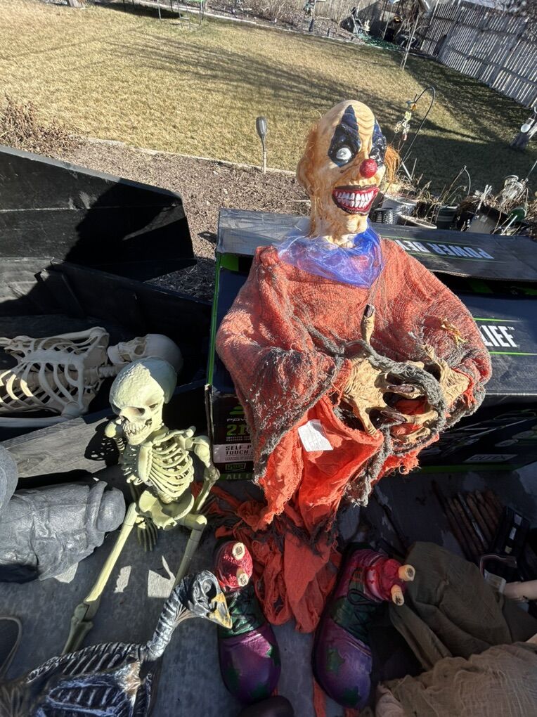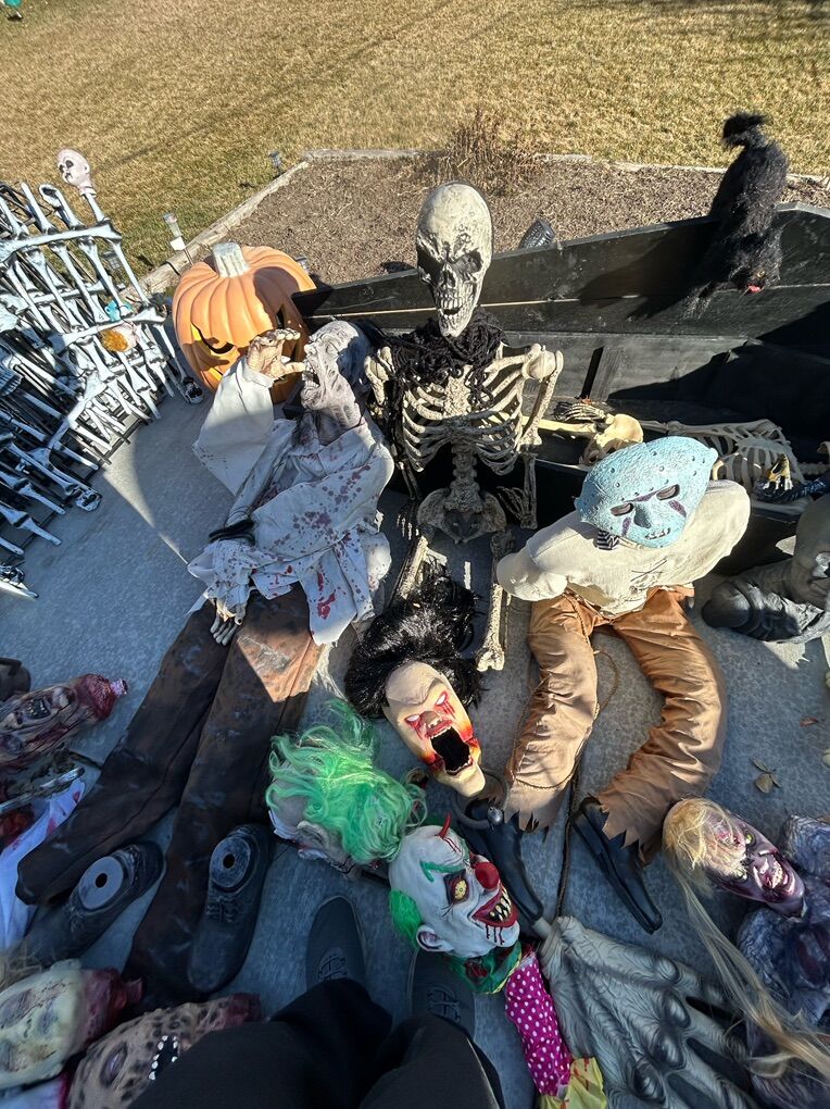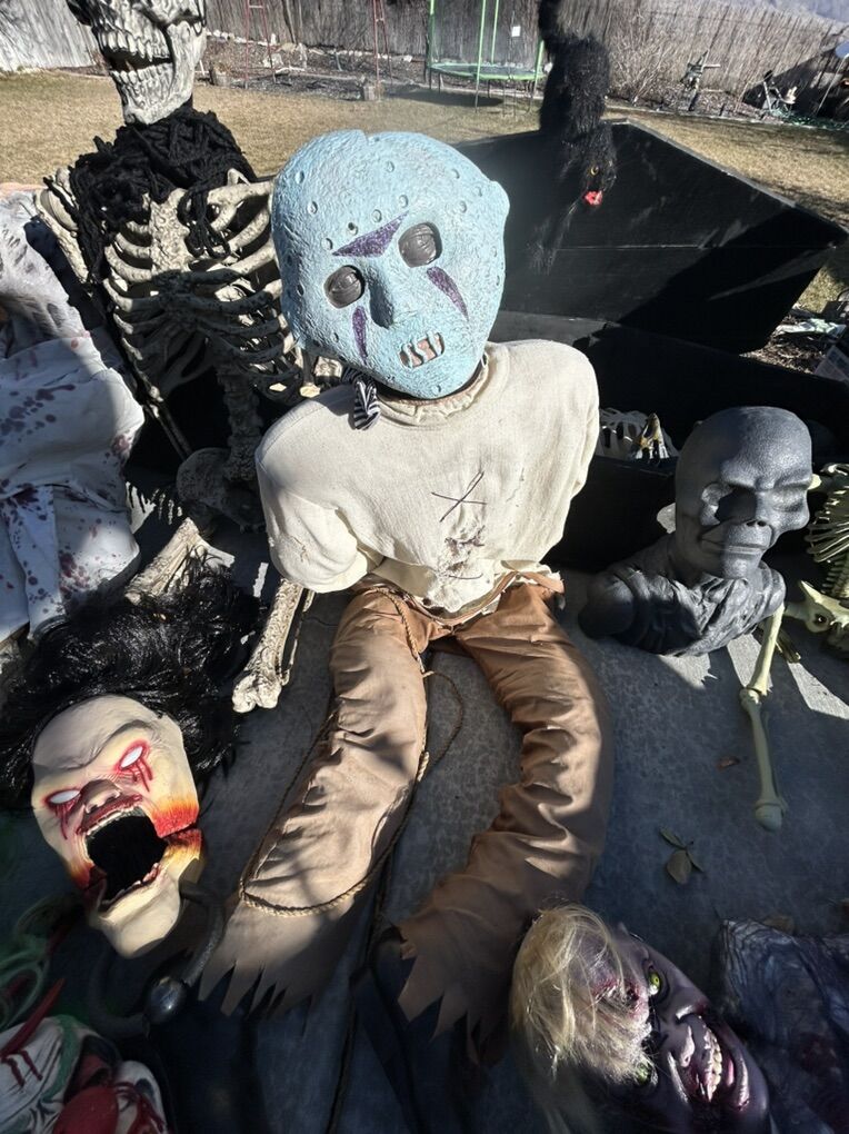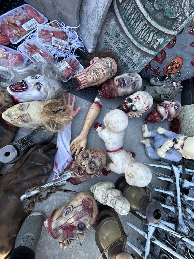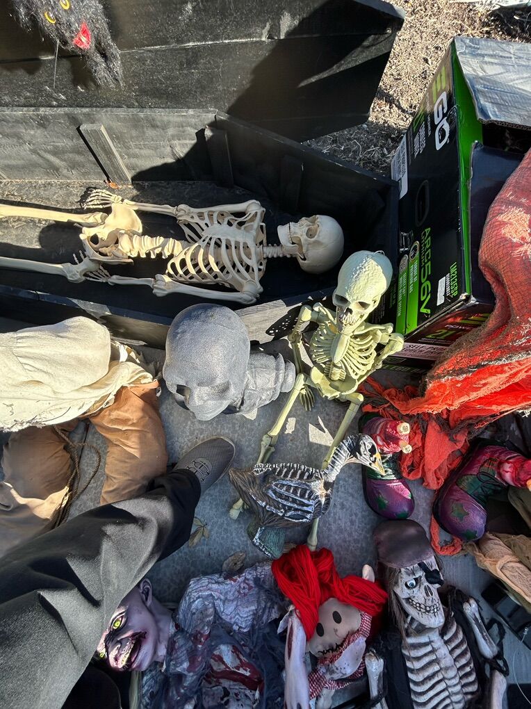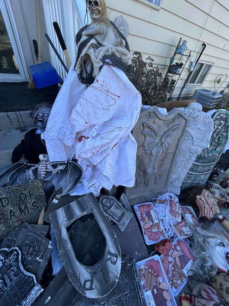 VenmoSee pictures for details, About 40 feet of interlocking metal fence with stakes, rubber scary heads, several foam headstones of various sizes, chop shop fake organ packs, fake liquid blood, bucket of spray paint cans, life size custom coffin with skeleton, various other spooky things. Must buy them all, not selling them separately, cash or Venmo only.