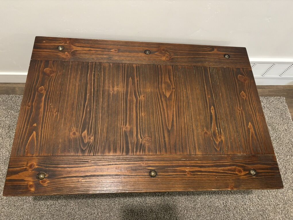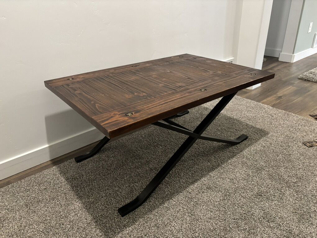 ApplePayrustic coffee table with a solid wood top and metal base. Strong, stable, and great for coffee, snacks, and whatever else ends up in front of the couch. Looks good, does its job, no drama.