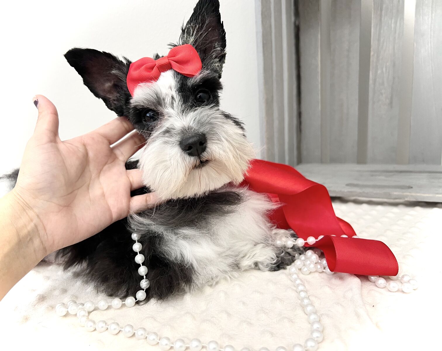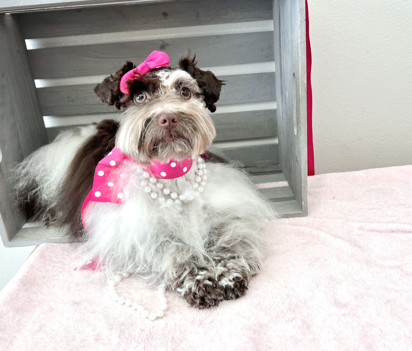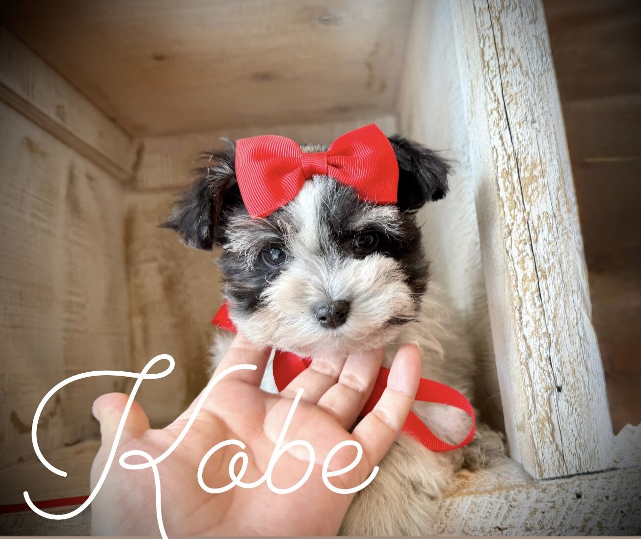 Oliver, Kobe, and Thor's mom is a rare chocolate Parti teacup -5.5-6lbs megacoated schnauzer. Sire is a rare micro teacup 4lbs Parti schnauzer.