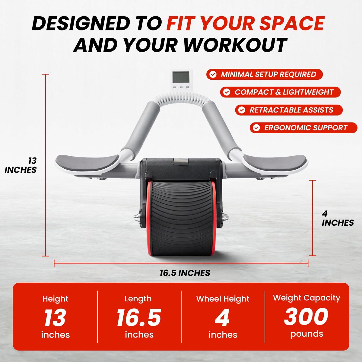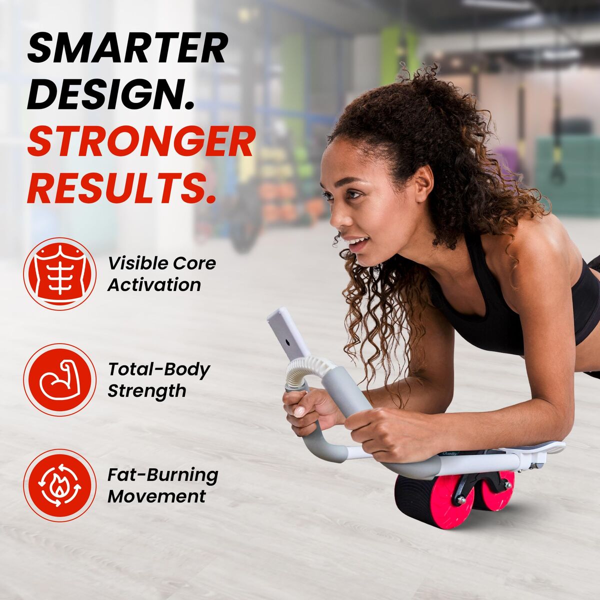 Stable dual-wheel design with padded handles. Includes resistance bands and knee pads. Excellent for home workouts and core training.