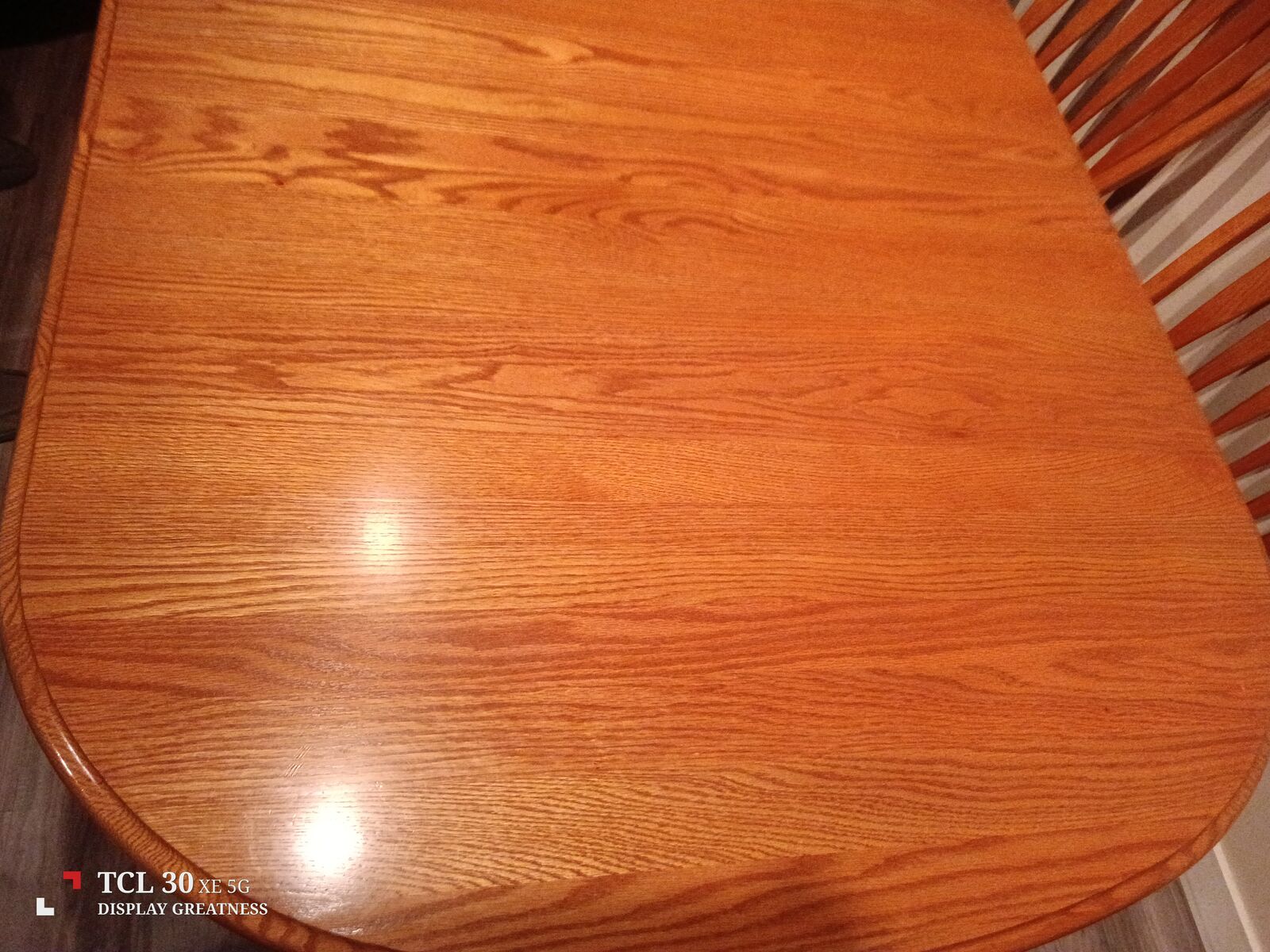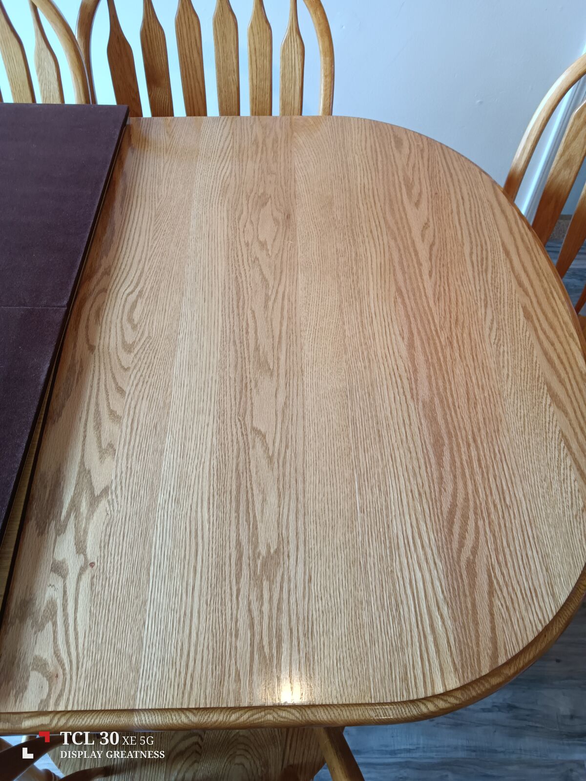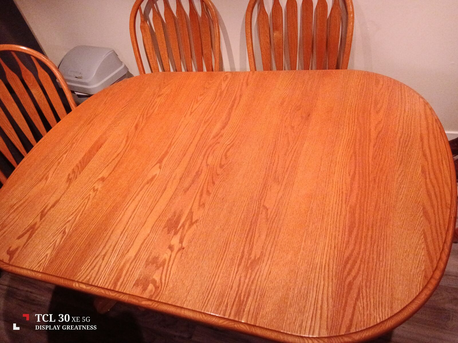Heavy table not fake pressed wood,has two leaves for extension tops ar in excellent condition have a cover for the top that has always been used to protect the surface of the table,solid table chairs are all in great shape their are six chairs two have arms,you pick up any time after 5pm is best ,CASH ONLY.