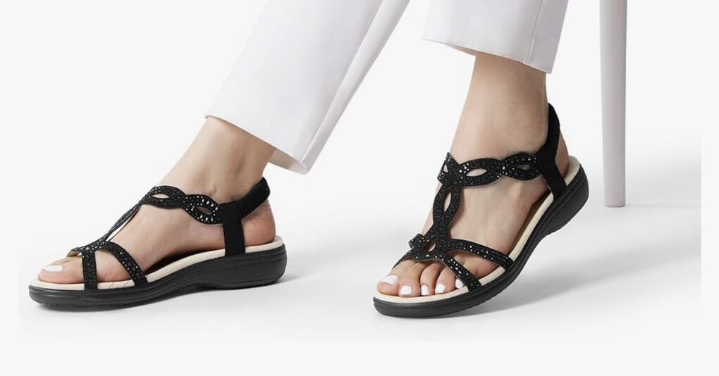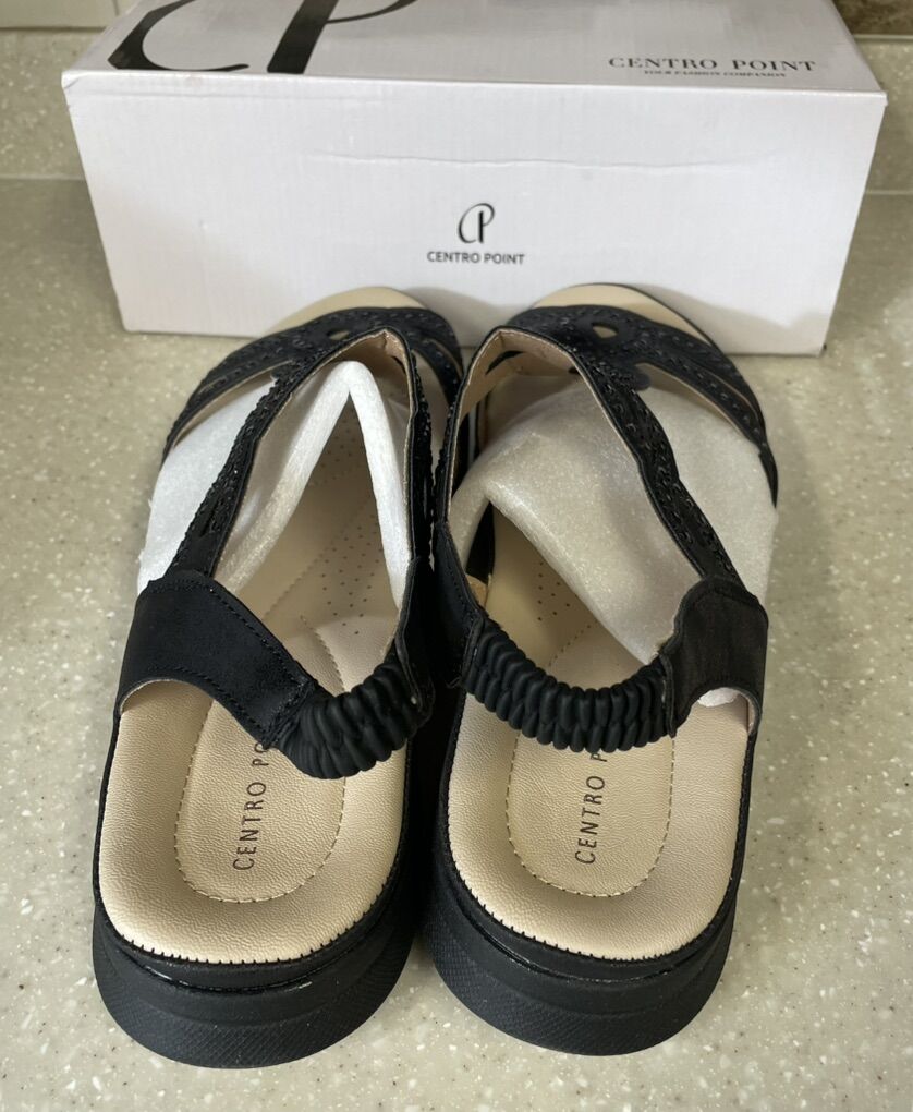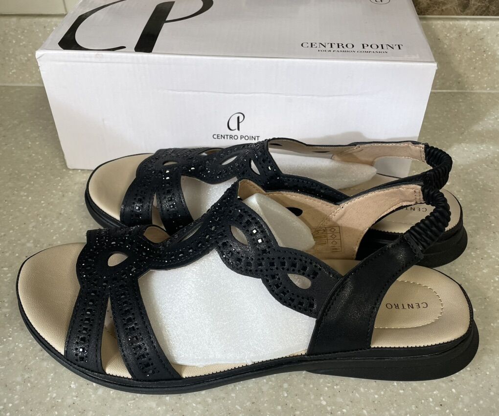 VenmoThe sandals pictured are from the brand Centro Point, as seen on the included shoebox and the footbed of the sandals themselves. Product Details These are women's flat, comfort-focused sandals designed for dressy or casual summer wear. Key features typically include: Design: A slip-on style with an elastic back strap for easy on-and-off. Upper: The straps feature an intricate cutout pattern, often embellished with rhinestones or beads for a dressy look. Comfort: These sandals generally prioritize foot health with cushioned footbeds, sometimes including arch support. Outsole: They typically utilize a lightweight, non-slip synthetic material like TPR for stability