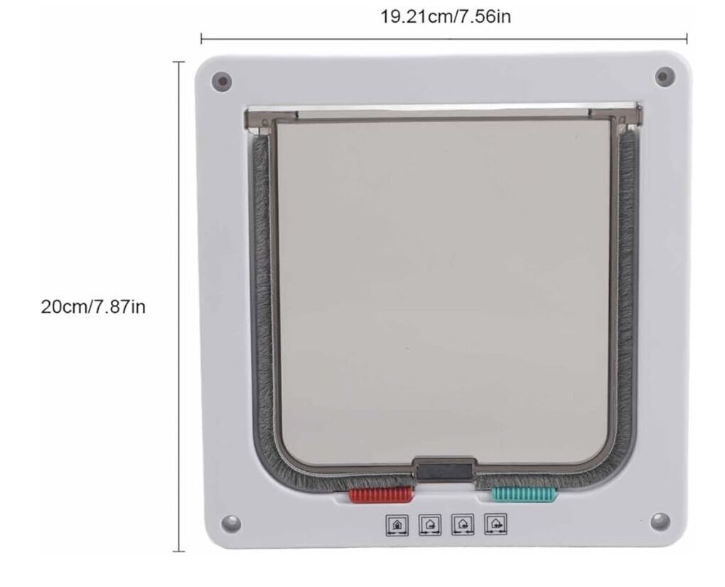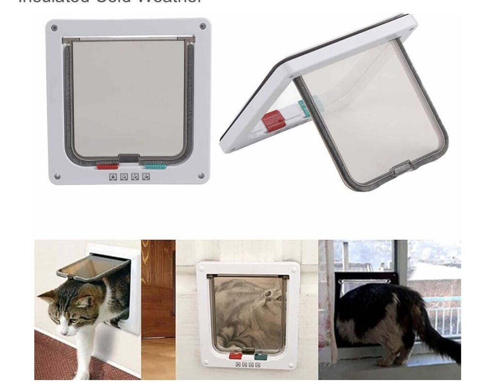 VenmoThis is a 4-way locking cat or small dog door. • Features four locking modes: fully locked, in only, out only, and both in and out. • Designed for DIY installation in various types of interior and exterior doors or walls. • Includes a transparent, weather-sealed flap with brush strips to minimize noise and drafts. • The package includes the necessary screws and caps for installation.