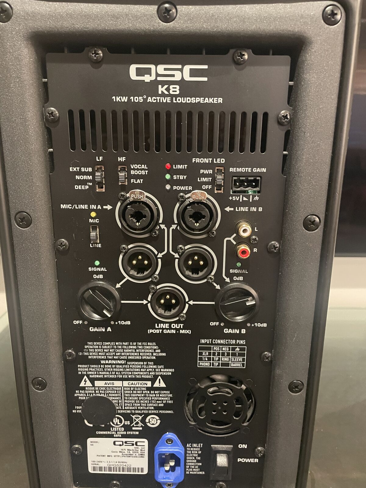 VenmoThis listing is for a QSC K8 loudspeaker. It's in great shape and sounds perfect. Specs are below. This speaker is surprisingly loud and has a built-in two channel mixer with XLR combo chacks as well as a third input for phones, tablets, or any other source you might use for playback.