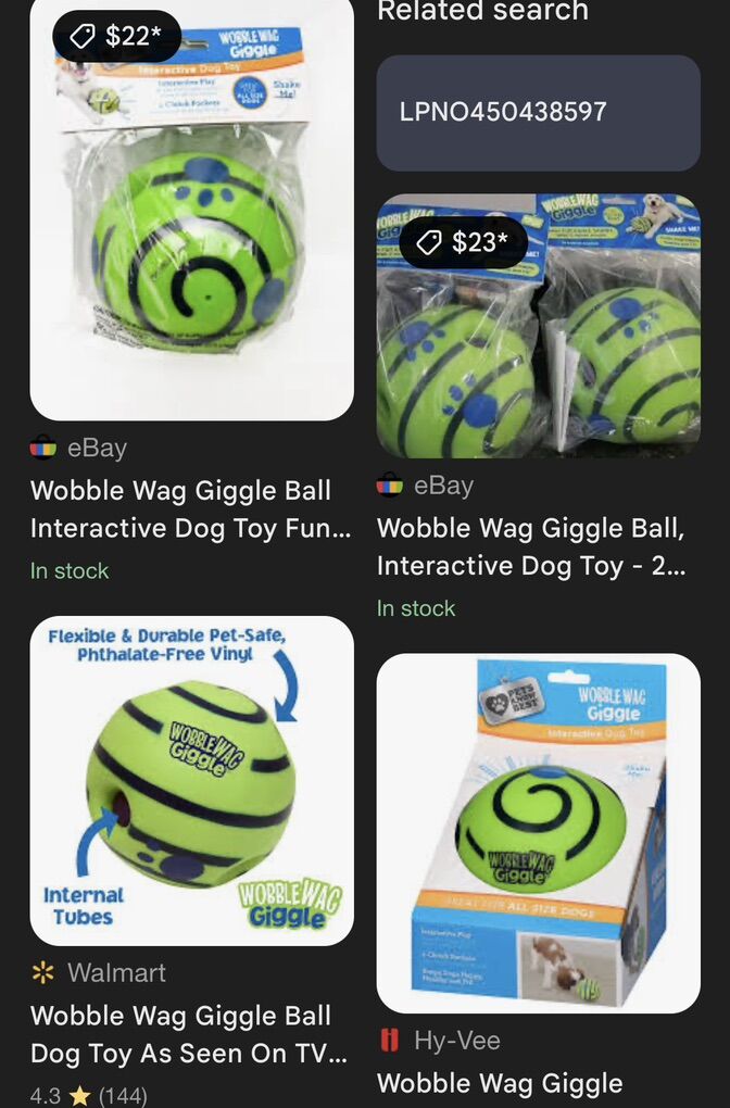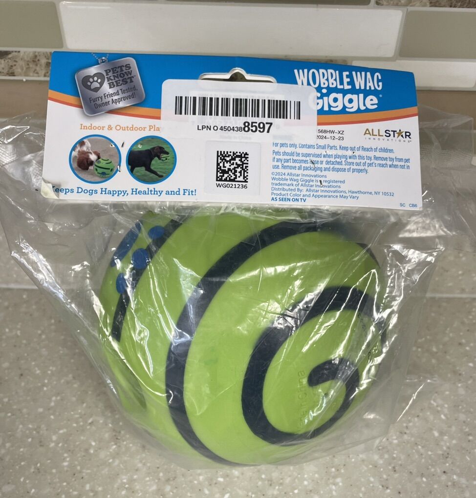 VenmoWobble Wag Giggle Ball, an interactive dog toy. It makes fun giggly noises when rolled or shaken, engaging a dog's natural play instincts. The sounds are produced by internal tubes and do not require batteries. The ball is made from durable, pet-safe, phthalate-free vinyl. It features 6 clutch pockets, allowing dogs of all sizes to easily grab and carry the ball. The toy can be used both indoors and outdoors.