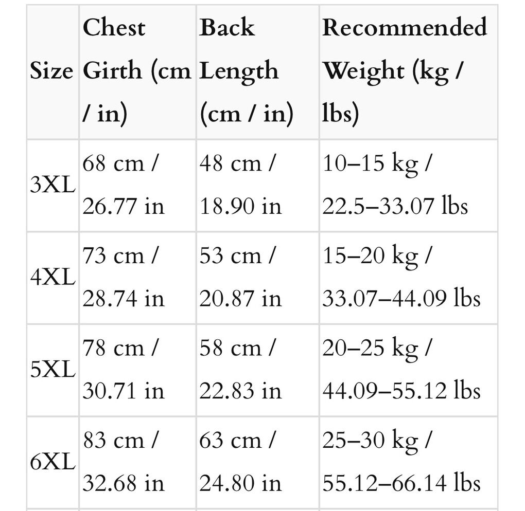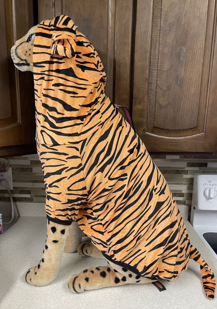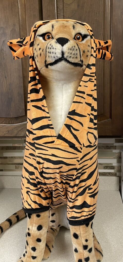 LARGE DOG TIGER COSTUME/PJS • Color: Orange • Plush polyester blend Sizing: • Designed for large dogs • Please measure using the Size Chart below before ordering, allowing an extra ¾ inch-14 inch (2 cm-3 cm) for some wiggle room • Available in 7 sizes: 3XL-8XL • When in doubt, or if between sizes, opt for the larger size
