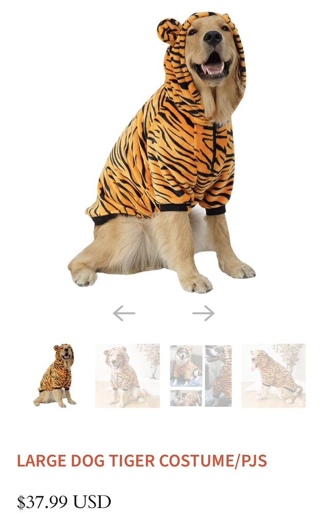 VenmoThis plush and warm Tiger Dog Costume comes in 7 sizes, for large dogs. Fun for Halloween or everyday cozy sleepwear.