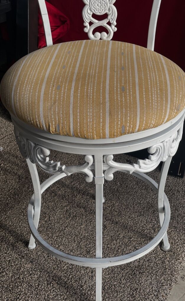 VenmoVintage White Iron Barstool with Ornate Backrest and Yellow Striped Cushion Such a darling chair Great condition Can deliver