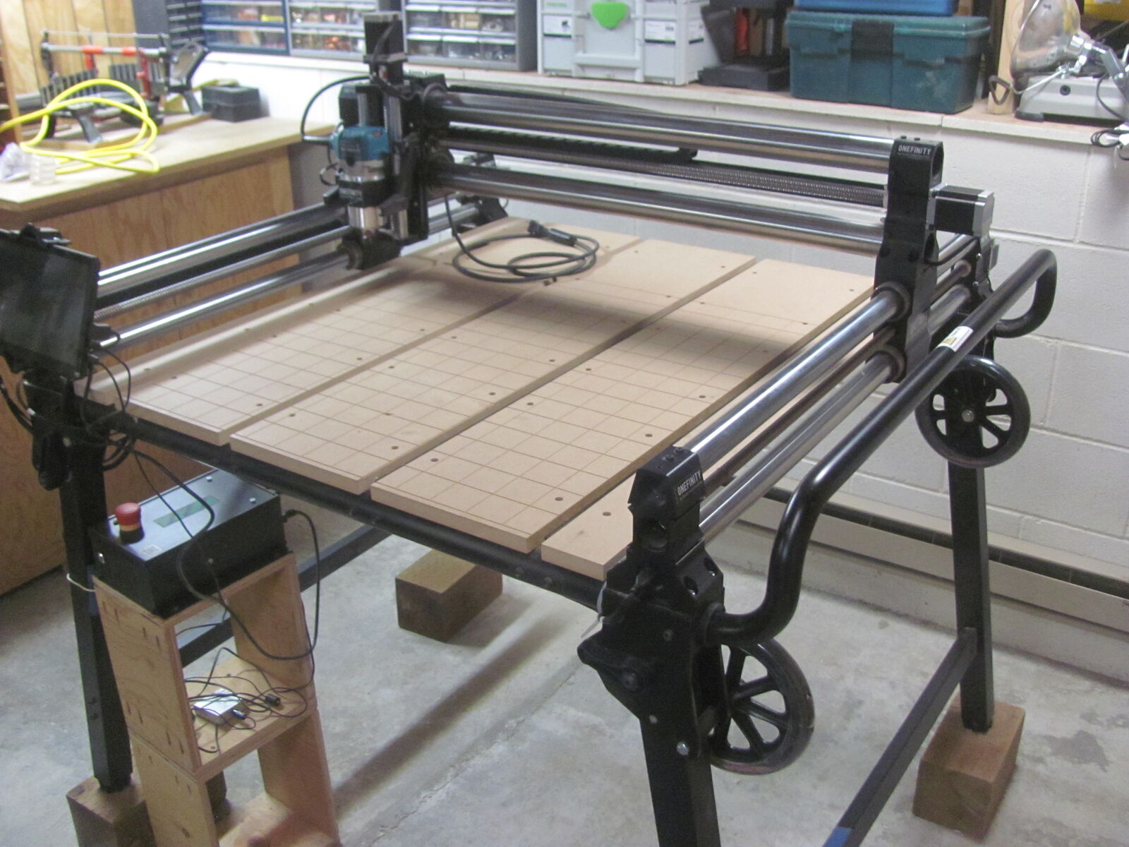 Onefinity CNC Machine purchased new in November of 2024 with 32 in. X 32 in. table. Includes: QCW Frame with wasteboard Rolling Folding Stand (entire unit can be folded up for storage) Makita 1 1/4 hp router Onefinity Controller Onefinity 3 axis touch probe Wireless Joypad Dust Boot Large selection of router bits including: 1/4, 1/8, 1/16, and 1/32 endmills, V-cutting bits (90, 60, 30, and 15 degree) and engraving bits